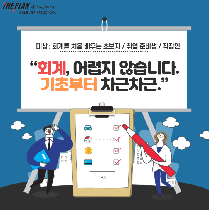 회계, 막연히 어렵게 느껴지셨나요? 숫자가 많고 용어도 낯설어서 ‘나랑은 안 맞을 것 같다’고 미뤄두셨다면 이번 과정은 조금 다르게 느껴지실 수 있습니다. “회계, 어렵지 않습니다. 기초부터 차근차근.” 처음 배우는 분들도 이해할 수 있도록 기초부터 단계별로 진행하는 회계 과정입니다. 수업 안내 과정명 화·목 저녁 7시 회계 과정 퇴근 후 부담 없이 시작할 수 있는 저녁 시간대 수업입니다. 이런 분들께 추천드립니다 ✔ 회계를 처음 배우는 초보자 ✔ 전산회계 자격증을 준비하는 분 ✔ 경리·사무직 취업을 준비하는 취업 준비생 ✔ 직장 생활에 회계 지식이 필요한 직장인 비전공자도 충분히 따라올 수 있도록 기초....... <img src="https://blogthumb.pstatic.net/MjAyNjAyMjZfMTk5/MDAxNzcyMDk1Mjg2NDUw.R_m8PPxnXm3BTEOjMzRjDXxerHLXkSP8Z_QDR4hvyHsg.8_oU-D8R-BIEwSfaCQmG0JFQEkSubaZUjeD5MWa6SJwg.PNG/image.png?type=s3" />