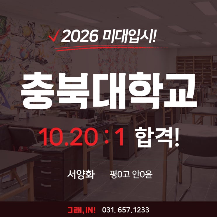 #평택 #평택미술 #평택미술학원 #평택입시 #평택입시미술 #입시 #입시미술 #입시미술학원 #입시준비 #입시미술준비 #그래인 #평택그래인 #평택그래인미술학원 #그래인미술학원 안녕하세요!! 소수! 정예! 밀착 피드백으로 "차이"를 만듭니다 지역에서 실력으로 인정받는 학원 평택미술학원, 그래인미술학원입니다 #충북대 #충북대학교 #국립대 #국립대학교 #국립충북대 #충북대합격 #충북대학교합격 #충북대수시 #충북대수시합격 #충북대정시 지난주에 이어 오늘 알려드릴 합격소식은 바로 충북대학교 합격입니다 충북대는 충청북도의 거점 국립대학교로 안정적인 학사 운영과 체계적인 커리큘럼. 탄탄한 기초조형교육이 바탕인 학교인....... <img src="https://blogthumb.pstatic.net/MjAyNjAyMjZfMTUw/MDAxNzcyMDg4OTEyMzE2.f7zdCB0EPMQHpLQkm1cdzhDTr6_FNFenboTzLeYImVIg.G1YjYqwQr_wdcEl2q1K8HUCvUyWmjaOV9N-IvN_lIFQg.JPEG/%C3%E6%BA%CF%B4%EB_%BE%C8%B0%A1%C0%B1.jpg?type=s3" />