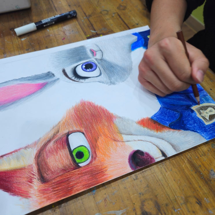 안녕하세요:) 이번에 초등부 아이들은 주토피아 그리기를 진행했어요 안 본 친구들이 없더라고요 ㅎ 아이들은 각자 가장 그리고 싶은 장면을 스스로 고른 뒤, 먼저 화지 위에 스케치를 천천히 옮기는 과정부터 시작했어요. 서두르지 않고, 화면의 구도와 인물의 위치를 충분히 관찰해야 해요 작은 것보다 크게 보며 스케치할 수 있도록 지도했어요 스케치도 계속해 봐야 느는 법이죠 뭐든 시간이 쌓여야 하는 거 같아요 동물이기 때문에서 자연스러운 털의 느낌도 잘 살려보려고 합니다 한 톤 한 톤이 모여 밀도 있게 튀어나와 보이게! 해보자:) 아이들에게는 이렇게 설명해 주었어요. “흰 종이를 3D처럼 만드는 거야. 그러면 어떻게 해야될까~한....... <img src="https://blogthumb.pstatic.net/MjAyNjAyMDFfNTUg/MDAxNzY5OTM5OTQ3MTg3.pFsblSuXVkYOM_brhvJEEDUkkMERog02y0vKzh2X7Bsg.iGQ5H306ADJKyawGrH0vHxU2a9jpNrEKugvt5l9O2uUg.JPEG/KakaoTalk_20260131_202934961_03.jpg?type=s3" />