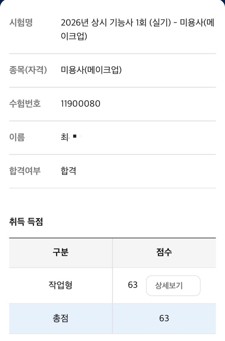 메이크업 국가자격증 실기 합격 소식 안녕하세요. 글딧뷰티스쿨 입니다 오늘은 글딧미용학원에서 메이크업 과정을 수강하신 수강생분의 메이크업 국가자격증 실기시험 합격 소식을 전해드립니다! 기초 이론부터 실기 동작까지 체계적인 커리큘럼을 통해 차근차근 준비한 결과, 메이크업 국가자격증 실기시험에 당당히 합격하셨습니다 메이크업 국가자격증 합격 포인트 글딧뷰티스쿨은 메이크업 국가자격증 시험 기준에 맞춘 실전 중심 수업을 진행하고 있습니다. ✔ 과제별 메이크업 표현 방법 ✔ 시험 시간 배분 훈련 ✔ 감점 요소 최소화를 위한 디테일 지도 ✔ 실제 시험과 동일한 반복 실기 연습 이러한 과정을 통....... <img src="https://blogthumb.pstatic.net/MjAyNjAyMDlfMjQ2/MDAxNzcwNjI3MjY0Njg5.pm8Zng_7vQ0ottIOMQIdVjQ57LuCTUtEvUqpMxyd394g.L4Eks8aEVE90ep5uPjYAUBFK3jBiFAfwDHu9s08yTSEg.JPEG/output%A3%DF830963473.jpg?type=s3" />