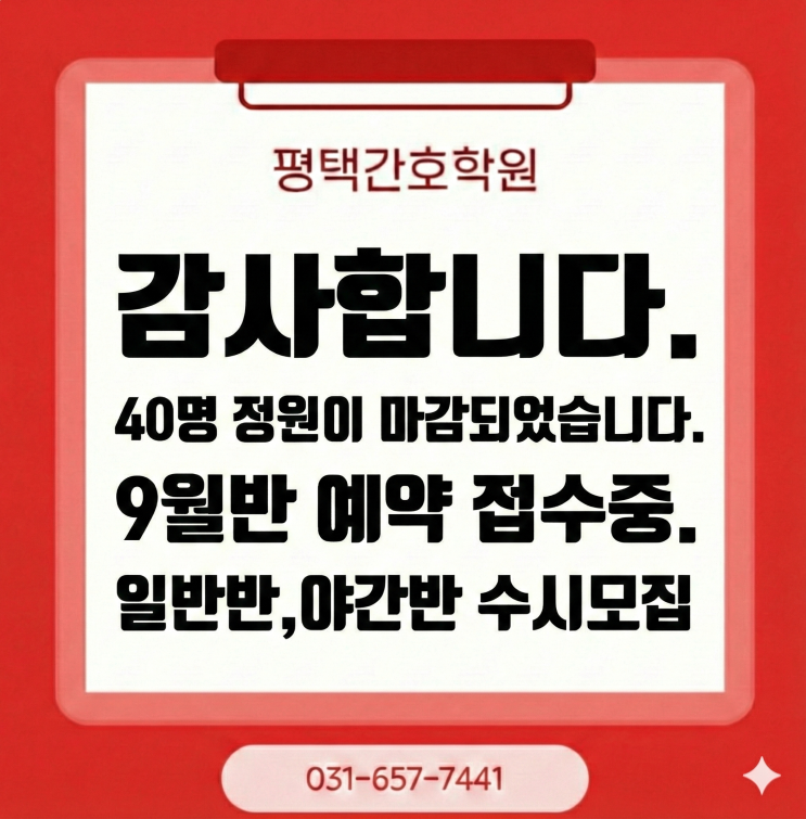 정원 마감 안내 & 감사 인사드립니다 평택간호학원을 찾아주신 모든 분들께 진심으로 감사드립니다 ✅ 정원 마감 안내 많은 성원 덕분에 3월 11일 개강반은 정원 40명 전원 마감되었습니다. 현재는 대기자 접수만 가능합니다. 9월 등록 예정이신 분들은 지금 미리 자리 선점을 추천드립니다. ⏰ 아직 한 달이나 남았는데? 개강일까지 약 1개월이나 남았지만, 이미 정원 마감이라는 놀라운 결과를 만들었습니다. 이 흐름, 괜히 나온 게 아니죠. 3회 연속 ‘정원 40명 마감’ 한 번도 아니고 두 번도 아니고 3회 연속 정원 마감 많은 분들이 선택해 주신 데에는 분명한 이유가 있습니다. 많은 학생들이 찾는 이유 ✔....... <img src="https://blogthumb.pstatic.net/MjAyNjAyMTFfMTM4/MDAxNzcwNzgxMTU0MzY5.409YJEL3sUAbVKyPIzOl23cgmo1_t026-aKP7E1t-R4g.le7cJTMcCSEuA3hvkSYRcpZAjYIfLhDAqASScVhxYWog.PNG/Gemini_Generated_Image_s7gsrms7gsrms7gs.png?type=s3" />