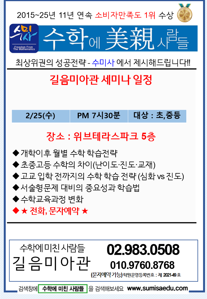 <수학에미친사람들 길음미아관 2월 세미나 안내> ▶일정: 2월 25일(수) pm7:30 ▶대상: 예비초4~중3(★학생 동반 강추!★) ▶연사: 황정희 수석원장 ▶장소: -서울시 강북구 삼양로27길 43 위브테라스파크 5층 (수학에 미친 사람들 길음미아관) -주차가능 ★예약 : 학생이름/학교/학년/→문자(010.9760.8768) 남겨주시면 예약 확인문자 발송됩니다. ☎ 전화 : 02-983-0508 문자 : 010.9760.8768 (수미사 길음미아관) 수학에 美親 사람들 학원은 중계관,대치관,반포관,의정부관,서초관,평촌관,선덕관,성북관,길음미아관 모두 직영관입니다. ※입반 테스트후 수시 입반 가능 ●신규생 테스트 및 상담예약 (전 학년 상담예약 가능) -02-983-05....... <img src="https://blogthumb.pstatic.net/MjAyNjAyMjBfMjA0/MDAxNzcxNTY4NzEzMDcy.8Iwk39vX3wV5KAEAPbDTRV6IAshzoxB-r8_H4BDp-Dgg.7xneYdApr1DPBiyY8cXeDT9Kg8fY8jkNez1Pog5gHL0g.PNG/%BC%B3%B8%ED%C8%B8%BE%C8%B3%BB%B9%AE%28260203%29.png?type=s3" />