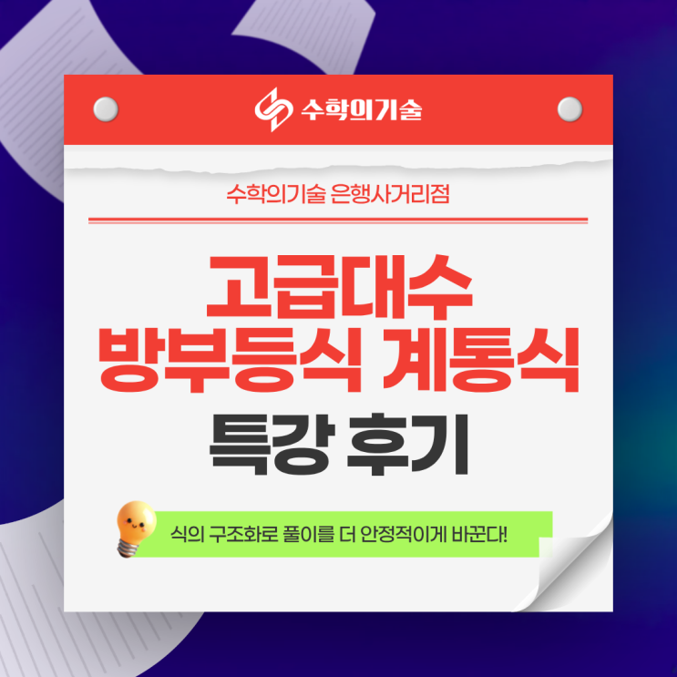 안녕하세요, 중계동 수학학원 수학의기술 은행사거리점입니다. 이번 겨울방학에는 처음으로 고급대수: 방부등식·계통식 특강을 진행했습니다. 방학 동안 어떤 방식으로 문제를 이해하고 풀어가야 하는지, 또 수업이 끝난 뒤 어떤 변화가 생겼는지 궁금하실 텐데요. 이번 특강은 ‘고급 대수’라는 이름이 붙어 있지만, 내용은 중등 과정의 핵심 파트를 개연성 있게 연결해 정리하는 수업이었습니다. 중1-1: 일차방정식의 풀이 → 활용 중2-1: 연립 일차방정식의 풀이 → 활용 중2-1: 일차부등식의 풀이 → 활용 세 파트를 따로따로 끊어서 보지 않고, 공통되는 풀이 흐름을 한 번에 잡아주는 방식으로 진행했어요. 그래서 문제가 조금만 달....... <img src="https://blogthumb.pstatic.net/MjAyNjAzMDNfMTkg/MDAxNzcyNTIwNDU1NDQx.4yWVlTna7k94Qu3hHq0unpT9sZgf9s1IV0FLfaNpxHQg.evLhSK2DBjAuurDbdcJ5dhfuwGpzKxmLqtRBC2UJQ4Ig.PNG/1.png?type=s3" />