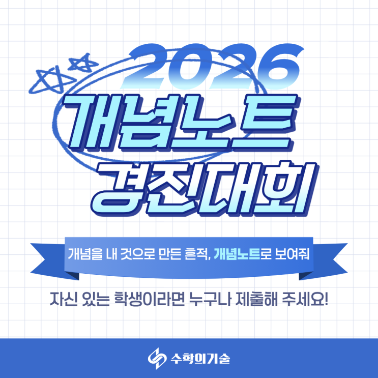 안녕하세요, 은행사거리 수학학원 수학의기술입니다 이번에 수학의기술에서 학생들이 배운 내용을 스스로 정리하며 공부 흐름을 단단히 만들 수 있도록 2026 개념노트 경진대회를 준비했습니다. 단순히 예쁘게 꾸민 노트를 뽑는 행사가 아니라, 개념을 이해하고 정리하는 습관을 점검하고 좋은 사례를 함께 나누는 시간이에요. 개념노트 경진대회, 어떤 대회인가요? 수학은 한 번 이해했다고 끝나는 과목이 아니라, 시간이 지나면 헷갈리는 지점이 꼭 생깁니다. 그럴 때 가장 도움이 되는 게 ‘내가 이해한 방식’으로 정리된 개념노트입니다. 이번 경진대회의 목적은 학생들이 개념 정리를 체계적으로 하도록 동기를 부여하고, 우수 노트 사....... <img src="https://blogthumb.pstatic.net/MjAyNjAzMDZfMTk1/MDAxNzcyNzg5OTA2NTMy.D197wY8mAXX6HhHaxy0AatnUNYdemF5i6yx-e3c2O7Ug.jfna20EJJWoQkGWEgu8LBrAhrKuSztwgztX5NECzkkkg.PNG/1.png?type=s3" />