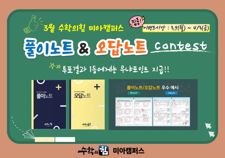 안녕하세요 미아동 수학학원 미아수학의힘입니다. 사랑하는 여러분 ! 수학 성적을 올리는 가장 확실한 방법은 풀이과정을 쓰는 습관입니다. 미아수학의힘 학생들이 ★ 생각하며 풀기 ★ 풀이과정 정리하기 ★ 틀린 문제 분석하기 이 세가지 학습 습관을 기르도록 '풀이노트 오답노트 바로알기' contest를 진행합니다. ◆ 대상 초등부 ~ 고등부 ◆ 평가기준 ● 풀이과정의 정확성 ● 정리의 깔끔함 ● 오답 분석의 충실도 ◆ 우수학생 시상 풀이노트왕, 오답노트왕에게 무냐포인트 지급 ◆ 기간 3/9(월) ~ 4/3(금) 좋은 공부 습관이 좋은 성적을 만듭니다! 모두 좋은 결과 위해 화이팅해요! #미아동수학학원#강북구수학학원#미아동초등....... <img src="https://blogthumb.pstatic.net/MjAyNjAzMDZfMjM4/MDAxNzcyNzg4Nzk5MTQy.MkAZECyCAG8ngyEKp21aI63JISAapyPVtYbFjxJsdrQg.aFZjNtqTEieh74S94Sfxy7kuOKgtNKycAfvcE6Zwj0Yg.JPEG/%C1%A6%B8%F1%C0%BB-%C0%D4%B7%C2%C7%D8%C1%D6%BC%BC%BF%E4_-001_%2874%29.jpg?type=s3" />