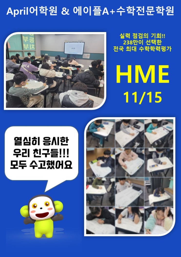 에이프릴어학원과 같이 운영 하는 수학전문학원 에이플+수학학원에서는 11월 15일 HME 수학학력평가를 실시했습니다. 응시하는 학생들 모두 그동안 공부한것을 바탕으로 열심히 하는 모습을 보았습니다. 결과에 상관 없이 자기 학년을 복습 한다는 의미로 꾸준하게 응시 한다면 고학년이 되었을때 분명 성과가 있을것이라 판단 됩니다. 이번에 응시한 모든 에이플+수학학원 학생들 정말 수고 많았습니다. <img src="https://blogthumb.pstatic.net/MjAyNTExMTdfMjc0/MDAxNzYzMzY4NzIyODQ5.tUenAIFP4oYnvsmdJAbhLQQLMUXDXvFEiRibZTCCFCAg.68RzGCD0HTNSCXmYh2cHkYiUGdbWi4WfO_pabi8gv0Ig.JPEG/1.jpg?type=s3" />