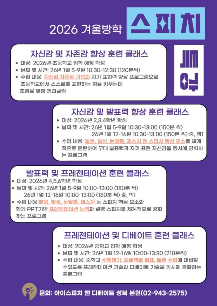 2026년 아이스피치 앤 디베이트 학원 방학특강 모집중입니다. 많은 관심 부탁드립니다! 문의: 02-943-2575 <img src="https://blogthumb.pstatic.net/MjAyNTEyMDNfMjQx/MDAxNzY0NzM3NjY3NjE4.WmqgSh7lm1-WpSYAJicT9J5XAQU4W4omQqy1z0W0c9gg.z5Dxv-fDyvEd6tbyVKFzbI0ejNZme1Sbmdsdk-0ATUQg.JPEG/26%B3%E2_%B9%E6%C7%D0%C6%AF%B0%AD_%C3%D6%C3%D6%C1%BE.jpg?type=s3" />
