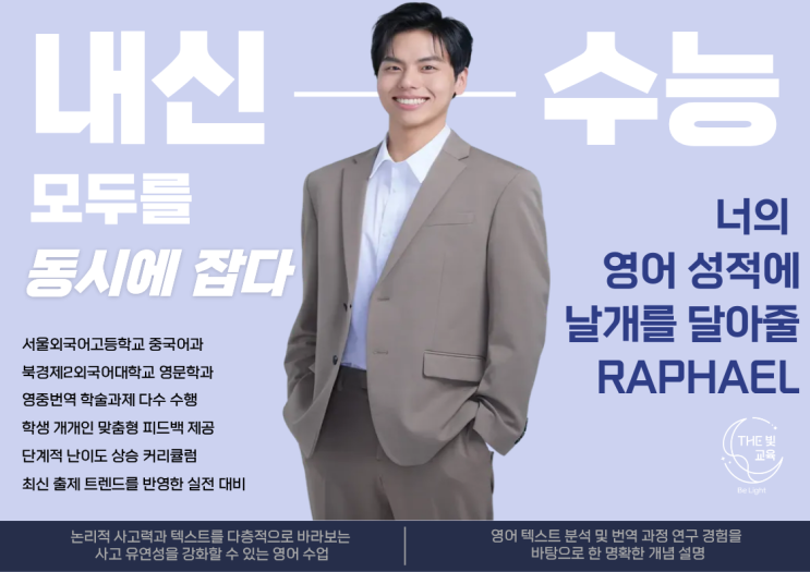 안녕하세요! 신일중 성암여중 영훈고 창문여고 신일고 혜화여고 영어 수학 전문 학원 더빛교육 세레나학원입니다! 더빛교육 세레나학원의 언어 능력자! Raphael 영어 선생님을 소개합니다! Rapael 선생님은 뛰어난 언어 이해 능력과 텍스트 분석, 번역 연구 경험을 토대로 개념을 명확하게 설명하는 선생님입니다. 서울외국어고등학교를 나와 북경제2외국어대학에서 영문학을 전공했으며, 다양한 번역 학술과제도 수행한 언어 능력자입니다! 학생 개별 맞춤형 피드백 제공 및 단계적으로 난이도를 높여 학생들이 영어를 어렵게 느끼지 않고 쉽고 즐겁게 학습할 수 있도록 만들어 주고 있습니다. 학교별 출제 트렌드를 반영해 수업하면서 어려운 유....... <img src="https://blogthumb.pstatic.net/MjAyNTEyMDdfMjQ0/MDAxNzY1MDgyODk2NzA3.kVM9mv6X3ti0hTjO9386FpX1aE1NG0dUsrkfr4DlV2Ag.sAB6XSXil57bRoJEQiNj9iDUpcak8IfPSXpxQDNzoUIg.PNG/Raphael.png?type=s3" />