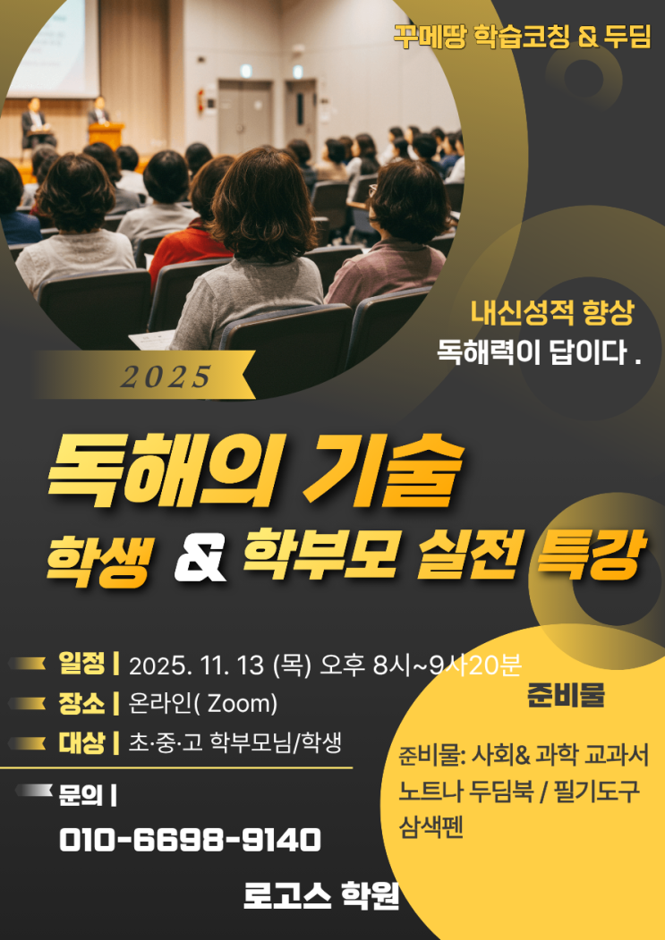 안녕하세요! 강북구 번동에 위치한 로고스 학원입니다. 11월 13일 자녀의 성적 향상을 고민하시는 학부모님을 위해 ' 독해의 기술 ' 설명회를 진행합니다. 성적향상 독해력이 답이다. 우리 아이들이 가장 힘들때가 언제일까요? 책상에 앉아 있고, 문제집도 풀고, 학원도 다니면서 열심히 노력했는데 성적이 오르지 않을때 입니다. 자녀분에게 한번쯤 들어보신 적 있지 않으신가요? '분명 공부했는데 시험만 보면 틀려요' '교과서도 봤는데, 설명을 잘 못하겠어요' '문제를 읽고 어디서부터 풀어야 할지 모르겠어요' 이건 의지나 노력의 문제가 아닙니다. 학습의 가장 기본인 '읽는 힘' 바로 &....... <img src="https://blogthumb.pstatic.net/MjAyNTExMDlfMTU0/MDAxNzYyNjE0NjI0MzA2.aPQVJQVfCSND-3yEYNSnAxQlA-Fw61endB_7Y7_pkmsg.a9YTKnpigFqPaDteB-dZ8iDSBpShAHmvuFBf-jmolGIg.PNG/%B5%B6%C7%D8%C0%C7_%B1%E2%BC%FA_%C1%A6%B0%F8_%C0%CC%B9%CC%C1%F6-_%BA%B9%BB%E7%BA%BB.png?type=s3" />