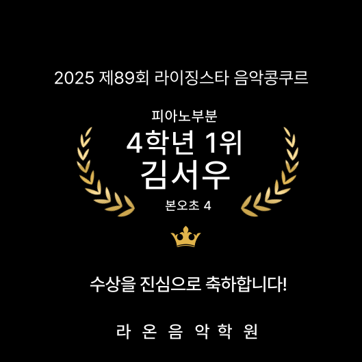 안녕하세요! 라온쌤입니다:) 서울 서초에서 있었던 2025 제 89회 서울 라이징스타콩쿠르 수상소식 전해드립니다! 피아노부문 4학년 1위 김서우 (본오초4) 매일 2-3시간씩 꾸준히 연습하던 우리 서우가 빛을 발했던 순간, 서울에서의 콩쿨을 도전한다는 떨림과 낯선곳에서 처음 연주하는 긴장감이 컸지만 기특하게 차분히 연습했던만큼 연주해주었고 결과도 좋아서 선생님도 너무나 뿌듯했답니다 앞으로가 더 기대되는 서우의 연주 수상을 너무너무 축하합니다❤️ 아이들의 감성을 키워주는 라온음악학원 #안산피아노학원 #안산피아노레슨 #안산라온음악학원 #라온음악학원 #본오초피아노 #각골초피....... <img src="https://blogthumb.pstatic.net/MjAyNTExMjRfMTYx/MDAxNzYzOTg1NTAyMDcz.txDg0CyEKDE-JkSemnfNQa93lrRuYRuD8xiNovDiywsg.LvNzs8ebgHiaYzimJ1nFL9BxIMUsJkN4Q9j47pgHqMAg.PNG/%C1%A6%B8%F1%C0%BB%A3%AD%C0%D4%B7%C2%C7%D8%C1%D6%BC%BC%BF%E4%A3%DF%A3%AD001%A3%A847%A3%A9.png?type=s3" />