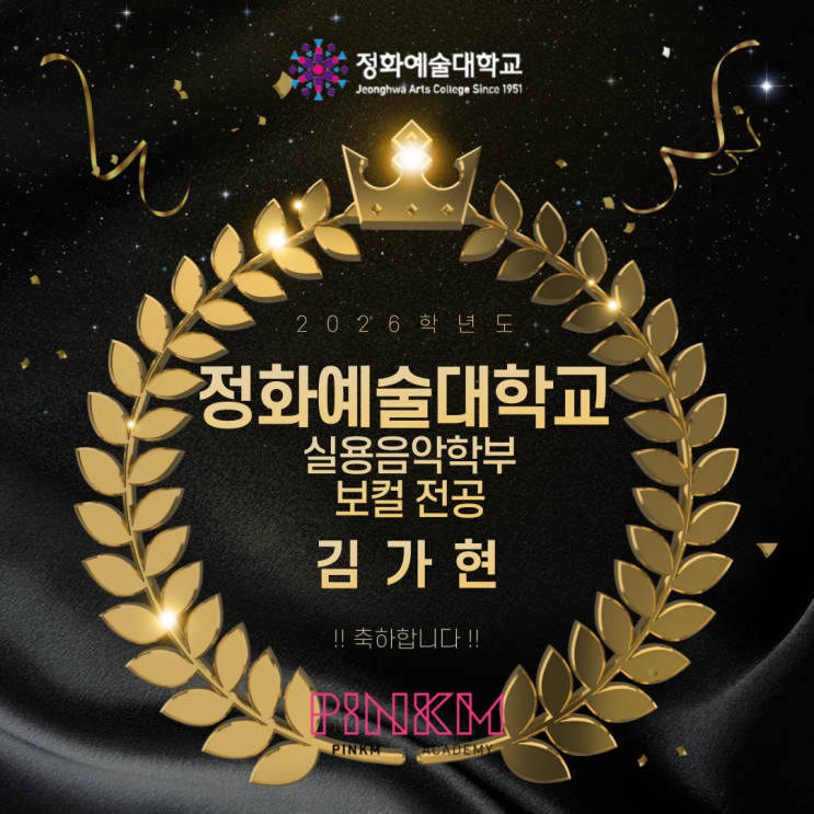 2026학년도 정화예술대학교 실용음악학부 보컬전공 합격 김가현 학생 . PinkM Dance 입시,오디션 전문학원 . 김가현 학생이 2026학년도 정화예술대학교 실용음악학부 보컬전공에 합격하였습니다. . 열심히 준비한 학생과 지도해주신 선생님께 감사와 축하를 드립니다. . #정화예술대학교 #강남댄스학원 #부천댄스학원 #안산댄스학원 #실용음악과입시 #실용무용과입시 #실용연기과입시 # 핑크엠 #핑크엠실용음악댄스연기학원 #오디션학원 #오디션 #내방오디션 <img src="https://blogthumb.pstatic.net/MjAyNjAxMzBfMTAz/MDAxNzY5NzYxMTM2ODA4.ZTVqzijA5jbwVuSp_8gqBuMo50ziuApcujFgsWkzA9Eg.nz_vp2wlIe-aPX71S7QrnfQ-cD-HTLoI1cijfKshOPMg.PNG/%C1%A4%C8%AD%BF%B9%B4%EB_%B1%E8%B0%A1%C7%F62_0.png?type=s3" />