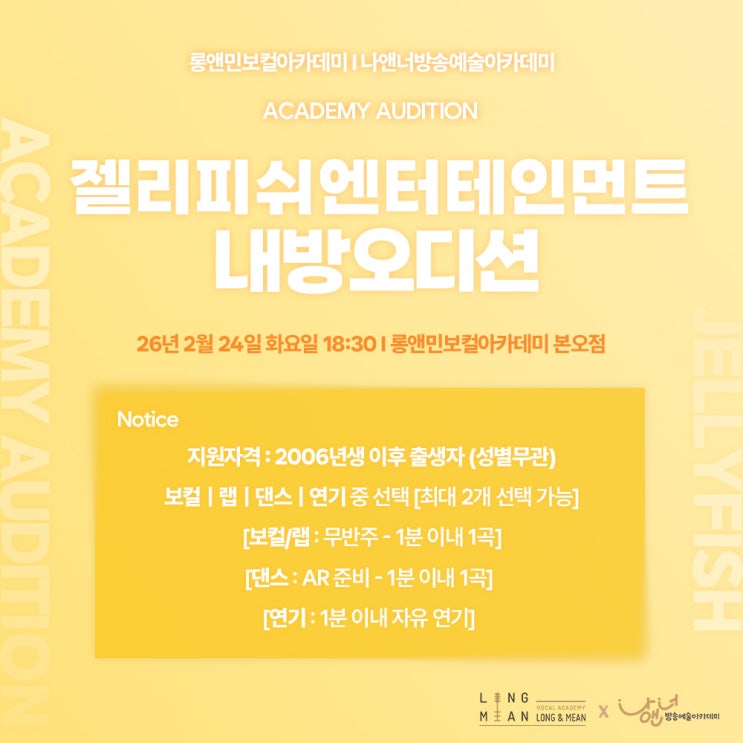 [나앤너방송예술아카데미X롱앤민보컬아카데미] 2026년 2월 젤리피쉬엔터테인먼트 내방오디션 안내✨/ 안산댄스학원 안산보컬학원 안산오디션학원 기획사내방오디션 오디션학원