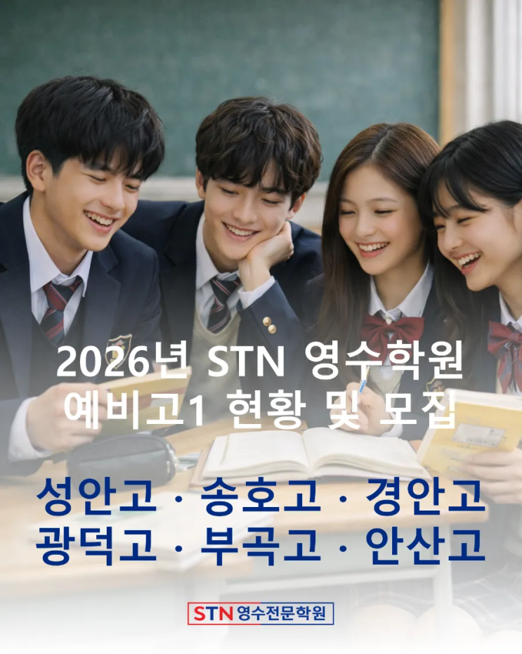 안녕하세요, STN 영수전문학원입니다. 1월, 예비고1 학생들의 고등학교 배정이 모두 완료되었습니다. 국어와 영어는 학교별 출판사가 상이하기 때문에 학생이 어느 학교로 배정되느냐에 따라 학습 방향과 교재 준비가 달라집니다. 그만큼 이번 배정 결과는 저희 강사진에게도 매우 중요한 순간이었는데요, 현재 STN 예비고1 학생들의 배정 학교는 다음과 같습니다. 성안고 · 송호고 · 경안고 · 광덕고 · 부곡고 · 안산고 총 6개 고등학교입니다. 학교별 교과서와 시험 출제 경향을 면밀히 분석하여 내신에 철저히 대비할 수 있는 커리큘럼으로 준비할 예정입니다. 고등학교 3년은 방향이 매우 중요합니다. 입시는 단기간의 성과가 아닌, 꾸준함과....... <img src="https://blogthumb.pstatic.net/MjAyNjAyMTZfNjIg/MDAxNzcxMjQwMTY0NTU1.Nfdyhu0IfYBIjCCvkg6g2pPFVAsqfl1joFsTY2K-jqAg.Dag7LYvuQpvSLzTKBi1BBHwGILhb2IszYaSrKEFQGb8g.PNG/900%A3%DF1771239752089.png?type=s3" />