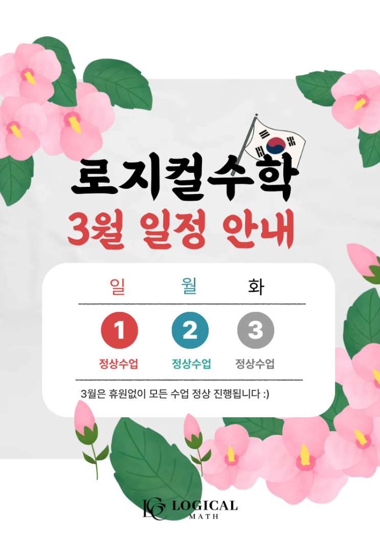 안녕하세요!! 내신부터 수능수학까지 책임지는 로지컬 수학학원입니다. 3월 개학 시즌을 맞이하여 저희 로지컬 수학학원은 새학기 내신대비 커리큘럼 중등부 컨텐츠강화 고3 실전 모의고사 특별반 준비를 위해 정신없는 하루를 보내고 있는데요~ 3월에는 새학기 시작과 함께 3.1절 공휴일이 포함되어 있어 학원 운영에 대한 문의가 많았습니다. 로지컬 수학학원은 ‘적은 분량이라도 매일 꾸준히 학습하는 힘’ 을 가장 중요하게 생각합니다. 따라서 3월에도 쉬는 날 없이 정상 운영됩니다. 3월 1일 (삼일절) – 정상 수업 3월 2일 (대체공휴일) – 정상 수업 개학으로 많은 학원들의 일정이 변경되고 있는 만큼 등원 일정에 변동사항이 있는 로....... <img src="https://blogthumb.pstatic.net/MjAyNjAyMjZfMjk3/MDAxNzcyMDg5NDQzOTky.E7XfuoUM_j7aVdTtdnhSAW81ZaOpEP0pEme7eKcXA0cg.iBiDSE2FZIOoc3RHrA069R0OhZv50jBg7Z7hdt7-INMg.PNG/%C1%A6%B8%F1%C0%BB_%C0%D4%B7%C2%C7%D8%C1%D6%BC%BC%BF%E4._%287%29.png?type=s3" />