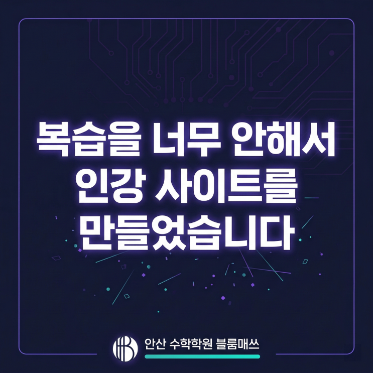 안녕하세요. 블룸매쓰 수학 강사 이태훈입니다. 복습 좀 해라! 그거 저번 시간에 다룬 내용이잖아! 아마 집에서 학부모님들도, 학원에서 저도 아이들에게 가장 많이 하는 잔소리 중 하나일 겁니다. 하지만 어느 순간 이런 생각이 들더군요. '아이들이 진짜로 게을러서 복습을 안 하는 걸까?' 그래서 아이들의 입장에서 생각해 보았습니다. 기존 복습 시스템의 치명적인 단점 그동안 저 역시 학생들의 철저한 복습을 위해 매 수업 영상을 촬영해 제공해 왔습니다. 분명 도움이 되는 학생들도 있었지만, 시간이 지날수록 아이들이 영상을 잘 열어보지 않는다는 것을 깨달았습니다. 이유는 간단했습니다. "스스로 찾아보기가 불....... <img src="https://blogthumb.pstatic.net/MjAyNjAzMDZfOTMg/MDAxNzcyNzkxMDYzMjk5.nrDZirWfvtq5Em2fIa2OvZAI3XhW-TAaxu0TP7Edoc4g.q9Dr-7xncLDwDvospToj4Qb4zogWLN5Yo80Qosl-EMsg.PNG/Gemini_Generated_Image_76d24c76d24c76d2_%281%29.png?type=s3" />