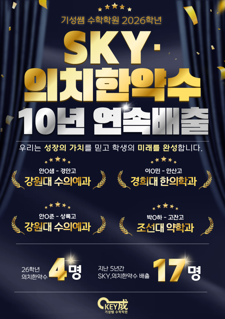수학은 기성쌤, 거인의 어깨에 올라 세상을 바라보라 안녕하세요. 기성쌤수학학원입니다. 2025년 입시가 마무리되었습니다. 2026 대입 실적 26학년 의치한약수 4명 안○샘 - 경안고 강원대 수의예과 이○민 - 안산고 경희대 한의학과 안○준 - 상록고 강원대 수의예과 박○하 - 고잔고 조선대 약학과 이○명 - 디미고 한양대 신소재학 정○경 - 고잔고 홍익대 기계공학 송○준 - 고잔고 한양대 국방지능정보융합공학부 (ERICA) 김○식 - 경안고 한양대 로봇공학 (ERICA) 4년장학생 김○태 - 경안고 강원대 간호학과 권○찬 - 광덕고 인하대 반도체학 이○찬 - 양지고 강원대 디지털밀리터리학과 이○현 - 고잔고 수원과학기술대 자동차학과 이○....... <img src="https://blogthumb.pstatic.net/MjAyNjAzMTBfOCAg/MDAxNzczMTA1NTI5OTg2.sMi8vQuD_4nRWhCIIzux1E0alLAmaVlBERfpCzcliPcg.VbH_0yp6YGgb5joffM9ImQHT_QspIdaqIqSuxhobiBkg.PNG/%B4%EB%C0%D4%BD%C7%C0%FB1.png?type=s3" />