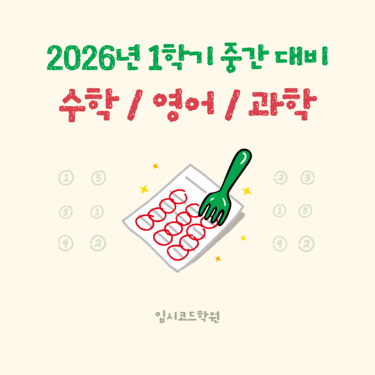 2026년 1학기 중간고사가 빠르게 다가오고 있습니다. 안산 선부동 지역에서 중1부터 고3까지 영어·수학·과학 내신과 수능, 모의고사를 함께 준비하는 입시코드학원에서는 학교별 맞춤 시험대비 시스템을 본격적으로 운영합니다. 와동중, 원일중, 선부중, 단원중, 석수중 그리고 강서고, 단원고, 선부고 학생들의 내신 유형을 분석하여 실전 점수로 연결되는 커리큘럼을 구성했습니다. 중학교 시험대비는 3월 31일부터 시작됩니다. 수학은 내신대비 ‘올백 문제집’ 수업과 함께 매쓰홀릭 워크북을 활용해 쌍둥이 문제 풀이까지 반복합니다. 특히 화요일, 목요일 수업에서 발생한 오답을 모아 금요일 오답 총정리 프린트로 다시 풀게 하여, 실수를....... <img src="https://blogthumb.pstatic.net/MjAyNjAzMjBfMjkg/MDAxNzczOTg3NjE2NzI2.LqRcVdd3rMfOsn_Afyp1AUH4ervteeIpOqWUhFunyQgg.RRcSuCdoAMdgbzd-0F4RDlrUlTrK21CtjGe7f3diBikg.PNG/%B1%D7%B8%B0_%B7%B9%B5%E5_%B1%CD%BF%A9%BF%EE_%C0%CF%B7%AF%BD%BA%C6%AE_%BC%F6%C7%D0%B4%C9%B7%C2%BD%C3%C7%E8_%B4%EB%BA%F1_%C0%C0%BF%F8_%B0%DD%B7%C1_%C0%CE%BD%BA%C5%B8%B1%D7%B7%A5_%B0%D4%BD%C3%B9%B0.png?type=s3" />