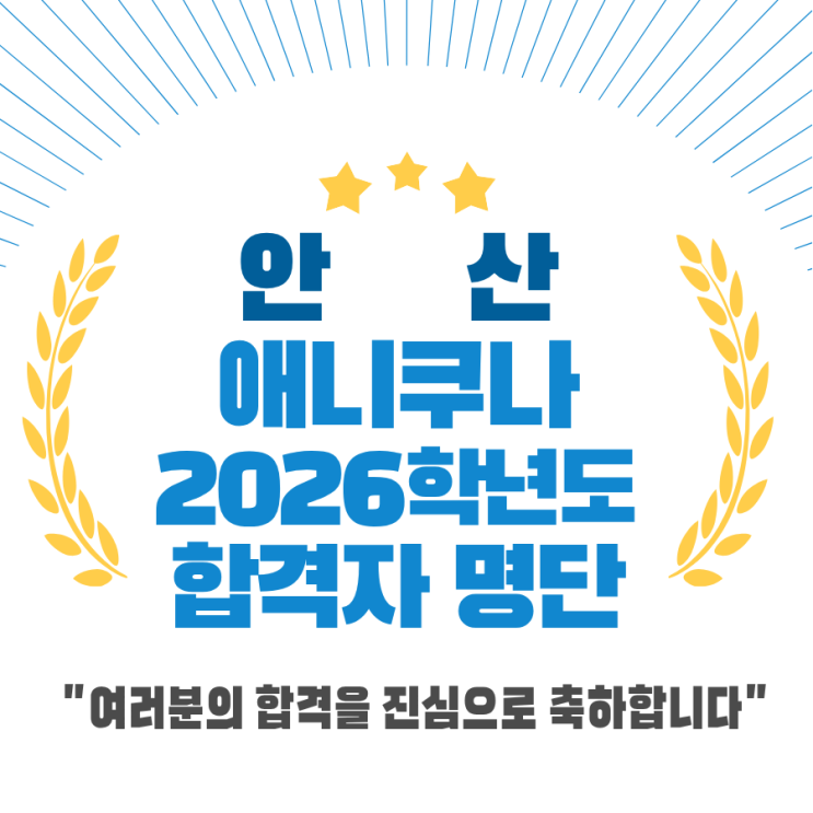 2026학년도 안산애니쿠나 합격자 발표 총 34명 지도, 82개 대학 합격! 안녕하세요, 안산애니쿠나입니다 2025학년도 합격자 명단을 정리해 올린 게 엊그제 같은데, 벌써 2026학년도 합격 소식을 전하게 되었습니다. 매년 이 글을 쓰는 순간이 가장 벅차고, 학생들과 함께한 시간이 떠올라 감회가 새롭습니다. 2026학년도 합격 성과 요약 ✔ 총 34명 지도 ✔ 총 82개 대학 합격 ✔ 1인 평균 2개 이상 복수합격 ✔ 청강문화산업대학교 10명 합격 단순히 “합격”이 아니라 여러 대학에 복수 합격하며 선택 가능한 결과를 만들어낸 한 해였습니다. "올해 결과가 특별했던 이유" 2026학년도는 특히 실기 유형 변화와 대학별 평가 방향....... <img src="https://blogthumb.pstatic.net/MjAyNjAzMDNfMjU1/MDAxNzcyNTMzMzIzMTc3.zzkJt0MsbZi8bPXL2YVNhxCIxV6tB64Hzmu4rl91dI8g.V4lO_-1wSy0VKcPalTCw-bIZvpz9kZjIWuq43Z3PKW8g.PNG/2026%C7%D0%B3%E2%B5%B5_%C7%D5%B0%DD%C0%DA_%B8%ED%B4%DC-_%BA%B9%BB%E7%BA%BB.png?type=s3" />