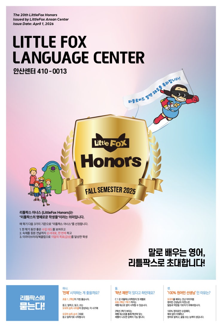 제 20회 리틀팍스 아너스, 25년 2학기 발행일: 2026년 4월 1일 발행자: 리틀팍스어학원 안산센터 리틀팍스 아너스 (LittleFox Honors)는 "리틀팍스의 명예로운 학생들"이라는 의미로, 매 학기 다음 3가지 기준으로 선정합니다. 1) 학기내 좋은 수업 태도를 보여주고 2) 온라인 숙제를 등원 전날까지 순서대로, 한번에 하고 3) 이라이브러리/북클럽으로 이달의 목표(금상)을 꾸준히 받은 학생 상을 받은 친구들은 이름, 사진과 함께 "나의 한 마디"를 타블로이드 신문에 실어줍니다. 실제 신문은 시상식을 통해 전달하겠습니다. 말로 배우는 영어, 리틀팍스로 초대합니다. 리틀팍스어학원 안산센터 <img src="https://blogthumb.pstatic.net/MjAyNjAzMThfODQg/MDAxNzczODA3MzA5NTc4.kj_RU7sGPkFwxYwwCvtc619l0x_C2ZF4ZsTK7gSbU7Ag.az0QTM4_iNRmT-Mh48D3SEF4cPDwfxB4vk9hNhbq6OAg.JPEG/KakaoTalk_20260318_083505056_01.jpg?type=s3" />