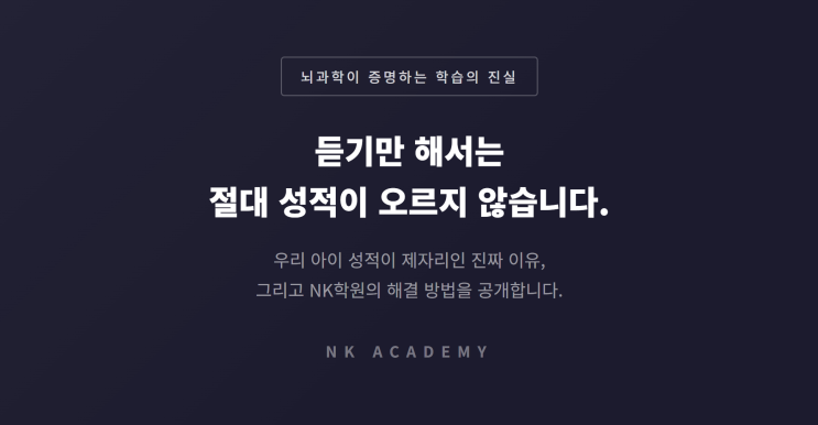 안녕하세요, 수학 전문 NK학원입니다. 이런 고민을 하시는 학부모님이 정말 많습니다. 문제는 '듣기'와 '이해하기'를 같은 것으로 착각하는 데 있습니다. 수업을 듣고 고개를 끄덕이는 것과, 실제로 문제를 풀 수 있는 것은 전혀 다른 영역입니다. 수업만 들으려면 월 8만 원짜리 인강이 훨씬 낫습니다. 학원은 '관리'를 하는 곳입니다. 1. "다 안다"는 착각 — 유창성의 착각 인지심리학에서 이 현상을 '유창성의 착각(Illusion of Fluency)'이라고 부릅니다. 선생님이 유창하게 설명하면, 학생의 뇌는 "나도 이해했다"고 착각합니다. 그러나 이건 선생님의 유창성이지, 학생 자신....... <img src="https://blogthumb.pstatic.net/MjAyNjAyMjRfNTkg/MDAxNzcxODY3NjM2ODQ0.Lp3I1UFcrU_OnOGMdzoI0xtrLwXqMpJmTT_KtVohcRYg.j5zduBFArXeW7JSgjm1pQhTN15AcqixnDiKZs-EDqwAg.PNG/image.png?type=s3" />