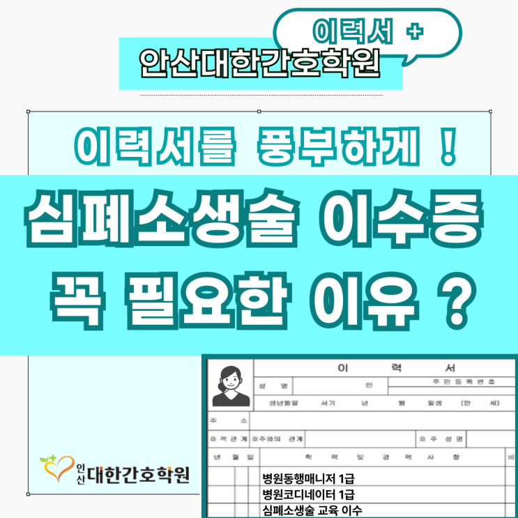 안녕하세요, 취업명문, 훈련비우대기관 안산대한간호학원입니다. 오늘은 저희 학생들 실습 전, 심폐소생술 교육을 실시했습니다! 실습 전, 그리고 취업 전 반드시 필요한 cpr 자격 ! 현장과 필요한 이유에 대해 말씀드리겠습니다. ✅ 심폐소생술(CPR) 교육이란? 심폐소생술(CPR) 교육은 심장이 멈추거나 호흡이 없는 응급상황에서 가슴압박과 기본 응급처치를 통해 생명을 유지하는 방법을 배우는 교육입니다. 이론으로만 배우는 것이 아니라 마네킹을 활용한 실습 중심 교육으로 진행되며, 실제 현장에서 바로 적용할 수 있도록 순서·강도·리듬을 반복 훈련합니다. 병원·의원에서는 예고 없이 응급상황이 발생할 수 있기 때문에 간호조무사에게....... <img src="https://blogthumb.pstatic.net/MjAyNjAxMjdfMjk4/MDAxNzY5NDc4MzQ1ODQ3.cwNLoa3a6omr0UOUFW0fa-J7S9tYa_ultlso70GiOwwg.6FXmGXNnif4k9uHj_fsZQFKCmmAYIz4FTpIaliPEVwQg.PNG/%C0%CE%BD%BA%C5%B8-%B0%D4%BD%C3%B9%B0-%BA%B4%BF%F8%C4%DA%B5%F0%B3%D7%C0%CC%C5%CD-002.png?type=s3" />