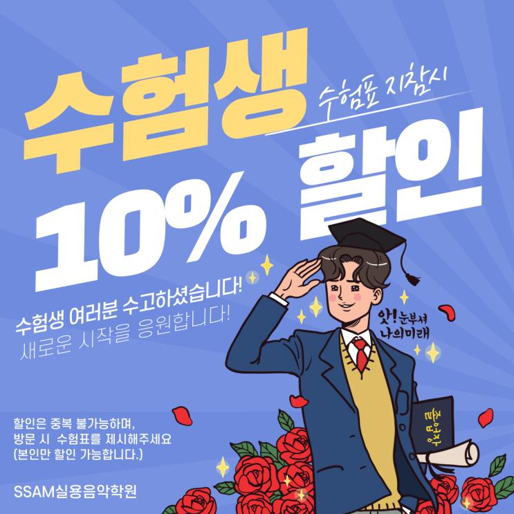 안녕하세요 고양동/삼송 쌤실용음악학원입니다:) 오늘은 수험생 이벤트 소식을 공유하려합니다!! 수험생 여러분, 정말 고생 많으셨습니다! 올 한 해 누구보다 치열하게 달려온 수험생 여러분을 위해 할인 이벤트를 준비했습니다 긴 시간 동안 목표를 향해 묵묵히 걸어가고, 때로는 지치면서도 끝까지 버텨낸 여러분의 노력이 앞으로의 길을 환하게 비춰줄 든든한 밑거름이 되길 진심으로 응원합니다 이제 잠시 숨도 돌리고, 스스로에게 작은 선물을 해주세요:) ⸻ 수험생 할인 이벤트 안내 대상 2025년 수능 응시생 (수험표 지참 필수) 이벤트 기간 2025.11.17 ~ 2025.12.31 혜택 수강료 10% 할인 ⸻ 수....... <img src="https://blogthumb.pstatic.net/MjAyNTExMTlfNTUg/MDAxNzYzNTQ1NDI5NTc5.ZRZ8bLijw2U4gdCtV2qTpq7y4ZcgOvSwEHdnAZY9V-sg.3Fby2KJChlH-nFoRYE7x1WlH_Ml9YuF0DRyfBM91fAsg.PNG/KakaoTalk_20251119_184324841.png?type=s3" />