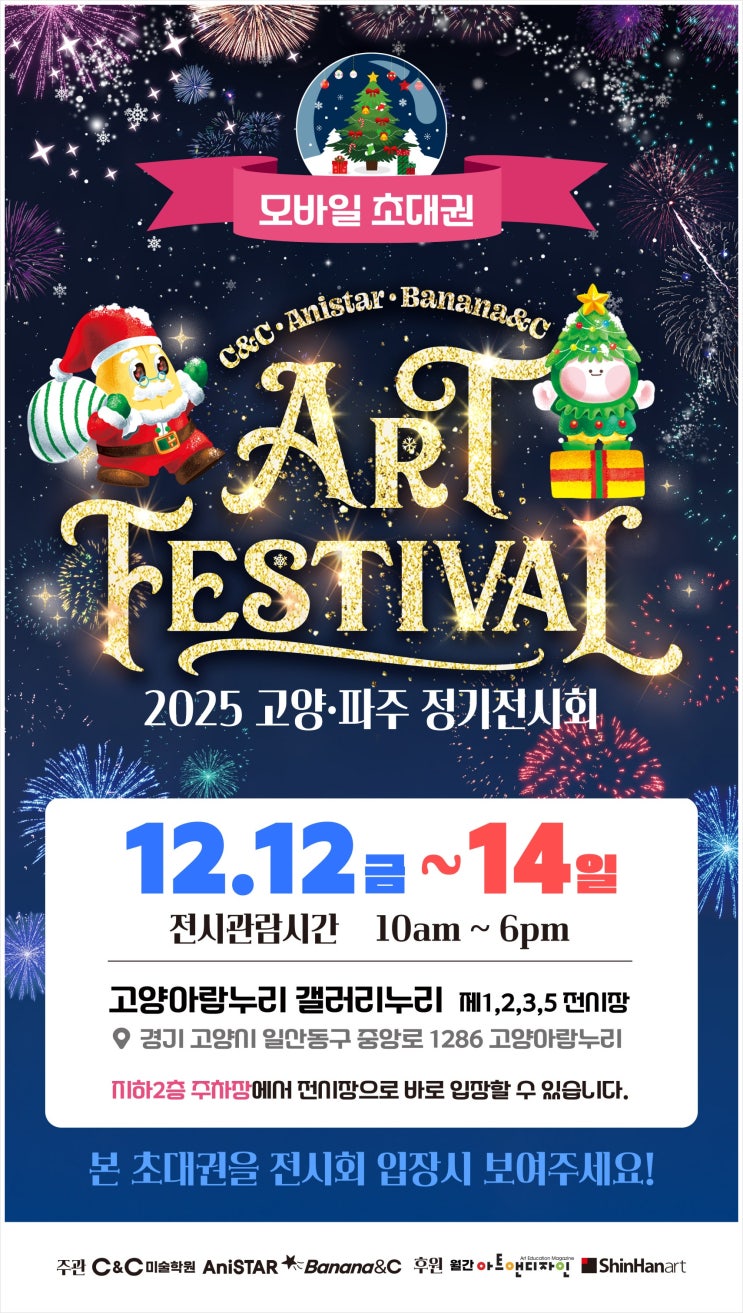 2025 C&C ART FESTIVAL 고양·파주 정기전시회 #화정미술학원 #화정만화학원 #삼송미술학원 #삼송만화학원 #능곡미술학원 #원당미술학원 #씨앤씨미술학원 안녕하세요! 화정 C&C 미술학원입니다 오늘은 특별한 소식을 전해드리려고 해요. 올겨울 C&C 미술학원 친구들이 함께 준비한 따뜻한 전시회! 2025 C&C ART FESTIVAL 고양·파주 정기전시회 가 열립니다! 크리스마스를 주제로 초등부부터 중등부까지 다양한 연령의 학생들이 한 땀 한 땀 정성껏 완성한 그림들이 고양 아람누리 전시장에 가득 펼쳐질 예정이에요. 2025 C&C ART FESTIVAL 고양·파주 정기전시회 전시 기간 : 2025년 12월 13일(금) ~ 12월 15일(일) ....... <img src="https://blogthumb.pstatic.net/MjAyNTEyMTBfMjE4/MDAxNzY1MzcxMjA3NjQ4.mipdvf0wmBWI_umwVuy5uvqyq__5CEL8fGXjXIvUgzog.hOkh0-nelTIaygT6RHFVNcat3HxwxW4P5wIM5KN8zhsg.JPEG/KakaoTalk_20251210_211927207.jpg?type=s3" />