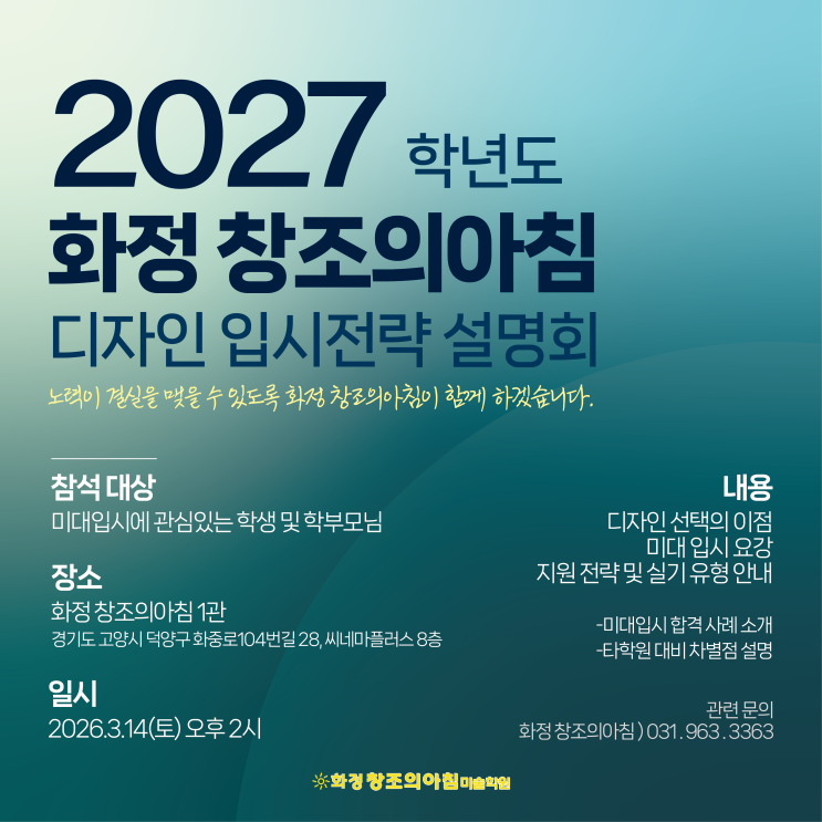 안녕하세요! 화정 창조의아침 미술학원 입니다 ! 새로운 시작의 계절, 3월 - 입시를 준비하는 학생들에게도 이 시기는 방향을 점검하고 전략을 세우기에 가장 중요한 시기인데요. 미대 입시는 단순히 그림을 잘 그리는 것만으로 결정되지 않습니다. 전형의 변화, 대학별 실기 유형, 학생부와 수능 반영 비율, 그리고 나에게 맞는 지원 전략까지 정확한 정보와 체계적인 준비가 무엇보다 중요합니다. 그래서 준비했습니다. 다가오는 3월, 미대 진학을 고민하는 학생과 학부모님들을 위해 화정 창조의아침에서 미대입시설명회를 진행합니다. 이번 설명회에서는 2027학년도 입시 흐름 분석부터 주요 대학 전형 정리, 실기 준비 방향, 그리고 지금 시....... <img src="https://blogthumb.pstatic.net/MjAyNjAzMDNfMTY0/MDAxNzcyNTIyMTM2MDI1.p3l_hKTiGW_QTMTu2lLy_QtP3og2RsRZ96dG2JMNNaEg._OezI5O3HfTQSSayg35h1ivSV3ZlgB1YWGc3gdm26-sg.PNG/%B5%F0%C0%DA%C0%CE%C0%D4%BD%C3%BC%B3%B8%ED%C8%B8-02.png?type=s3" />