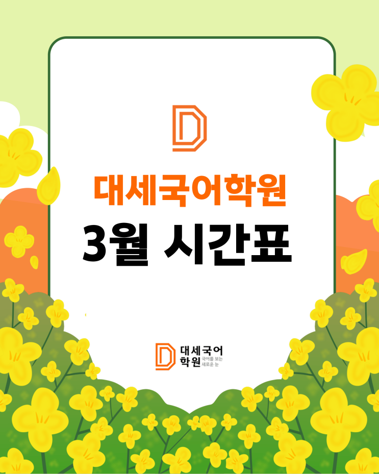 안녕하세요. 대세국어학원 입니다. 2026 3월 시간표를 안내드립니다. 본격적인 학창생활이 시작되는 3월입니다. 작년과는 다른 일상이 이어지는 것과 동시에 세웠던 목표를 향해 노력을 시작하는 시기이기도 합니다. 밝고 따뜻해진 날들 만큼이나, 목표를 향해 달려가는 길이 순탄할 수 있도록 고된 일을 덜어주는 가이드가 되겠습니다. 언제나 감사드립니다. 언제나 감사드리며, 앞으로도 응원하고 지지해주는 대세국어학원이 되겠습니다. ☎ 상담 예약 및 문의사항 ** 대세학원 삼송 캠퍼스 (신원로 40-44) 4F[고등 전문관 / 수학, 과학] 5F[초, 중등관 / 수학 / 입학상담] 6F[초, 중등관 / 국어, 영어, 논술] 7F[고등 전문관 / 국어....... <img src="https://blogthumb.pstatic.net/MjAyNjAyMjdfMTkx/MDAxNzcyMTg3MDExNzI2.gMox8XRyE_z54M3zb17nDcGq6ff5l3C8oqcfaMF-yNsg.AUMUEhiqZlbw-0jldFBpyuSLAeVDSm-u4qzp419VEf8g.PNG/0.png?type=s3" />