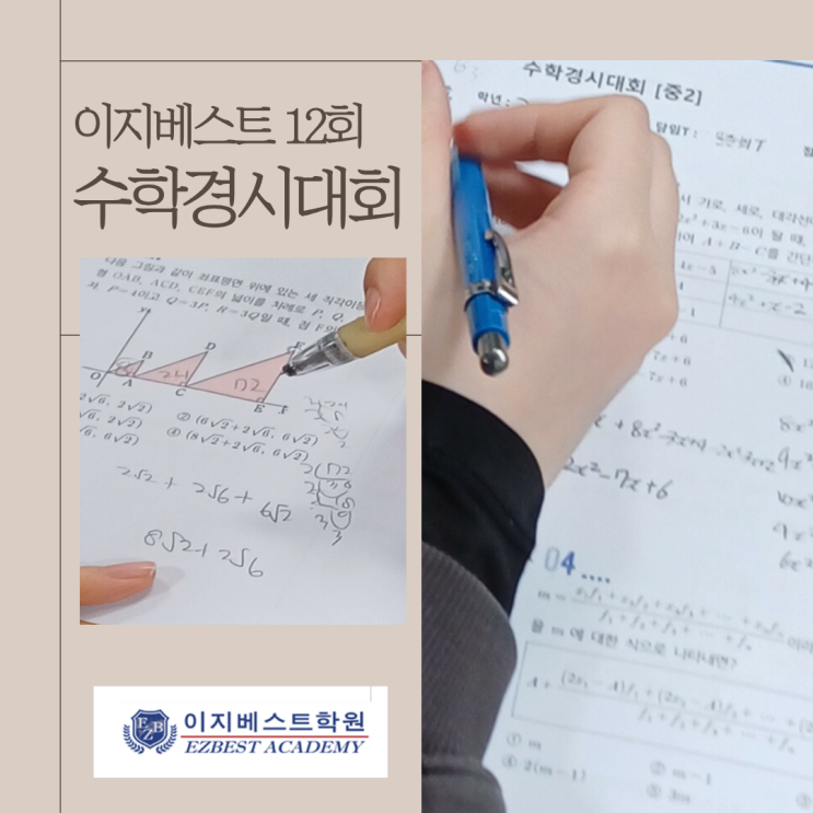 2월 26,27,28(목,금,토) 이지베스트 학원에서 제 12회 수학경시대회가 열렸습니다 총상금 200만원이라는 통 큰 장학금이 있는 이지베스트~! 공부할 맛 나죠^^! 수학은 개념학습이 수학점수의 핵심이라고 해도 과언이 아닙니다. 그렇기에 화정동 수학학원 이지베스트는 <공식암기 비법서>로 학생들의 수학공식 암기를 쉽게 도와주며 기초에서부터 응용까지 탄탄하게 잡아줍니다. (오직 이지베스트에만 있는 수학책이랍니다!!) 이지베스트 학원에서는 1:1수업으로 비법서와 함께 선행과정을 진행합니다. 선행학습을 탄탄하게 하며 방학동안에 경시대회에 응시할 만큼 기본실력을 쌓아놓으니 내신에서 서술형까지 100점을 맞을 수 있습니다 오....... <img src="https://blogthumb.pstatic.net/MjAyNjAyMjdfODIg/MDAxNzcyMTk0NDAzNDIy.fq_tpHSVojMe6-428MSmHP4T86YsjbZE5WPdtJx4gf4g.5RfYx_dFji5YO0mlv86Jhc6-AaRB9qar3O2o5BApFEUg.PNG/%C1%A6%B8%F1%C0%BB_%C0%D4%B7%C2%C7%D8%C1%D6%BC%BC%BF%E4._%288%29.png?type=s3" />