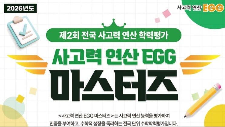 안녕하세요~ 삼송다올수학 리니쌤입니다. 2026년 사고력연산 에그마스터즈 안내드립니다. ♧우리 저학년 다올이들의 실전 도전♧ 우리 다올이들은 문제를 많이 푸는 아이들이 아닙니다. 스스로 생각하고, 끝까지 해결해보는 아이들입니다. 저는 늘 말합니다. “한 번 더 생각해봐.” “끝까지 해보자.” 이런 해보는 경험이 쌓이면 시험이 두려운 것이 아니라 도전할 대상이 됩니다. EGG 마스터즈는 단순한 실력 점검 시험이 아니라, ✔ 개념 이해도 ✔ 문제 해결력 ✔ 사고 확장 능력 ✔ 응용·심화 역량 을 객관적으로 진단하는 사고력 기반 인증 프로그램입니다. 이번 인증 과정을 통해 현재 수학적 위치를 정확히 분석하고, 향후 학습 방향과....... <img src="https://blogthumb.pstatic.net/MjAyNjAyMjhfMjc0/MDAxNzcyMjM5NzgyMzk2.6J3N-gkBywYx6tD4zUuG8abKzS02EWga3eJO-NMB1sMg.0bkiLUBvPY0lL_niI7UKiqQWfXKH5ZdOZRzl1Naqf5gg.JPEG/900%A3%DFScreenshot%A3%DF20260228%A3%DF094529%A3%DFNAVER.jpg?type=s3" />