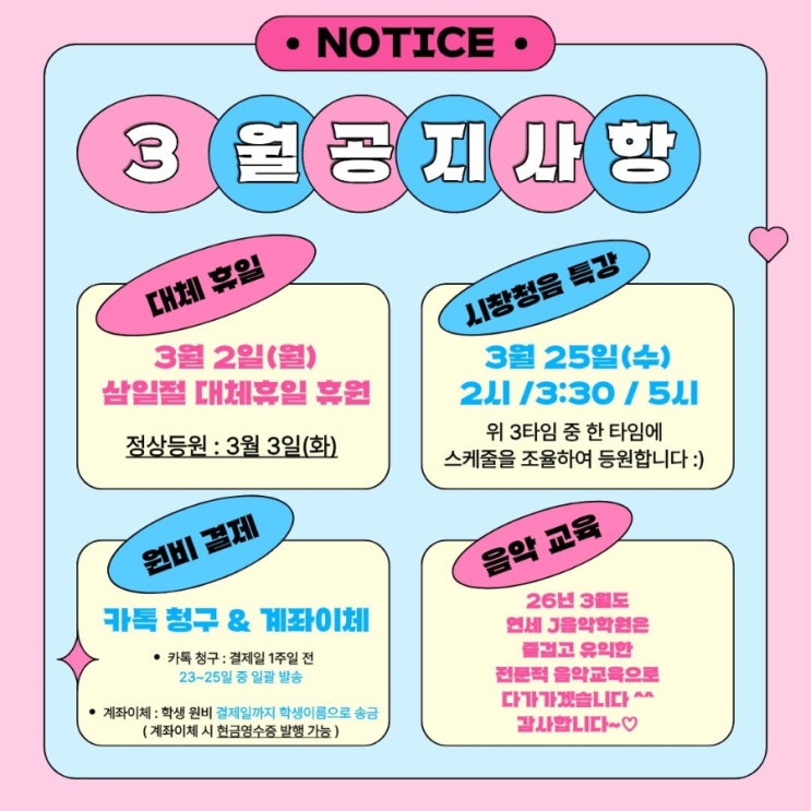 3월 학원 공지사항 ■ 대체 휴일 3월 2일(월)은 삼일절 대체휴일로 휴원합니다. 정상등원은 3월 3일(화)입니다 :) 일정에 참고 바랍니다 ■ 시창청음 특강 3월 25일(수) 2시 / 3:30 / 5시 연세 J음악학원 아이들의 다양한 음악적 경험을 할 기회를 위해 홀수달 마지막 주 수요일은 예술융합특강을 진행합니다! 위 3타임중 한타임에 스케줄 조정하여 특강에 참석합니다 ■ 원비 결제 안내 ✔️ 카톡 청구 : 결제일 1주일 전 매달 23~25일 일괄 발송 ✔️ 계좌이체 : 결제일까지 학생이름으로 송금(계좌이체시 현금영수증 발행) 병오년 26년에도 연세 J음악학원은 즐겁고 유익한 전문 음악교육수업으로 다가가겠습....... <img src="https://blogthumb.pstatic.net/MjAyNjAyMjBfMTQ1/MDAxNzcxNTc0NTcwMjYw.Enbro5-s4bEctD1M8PMja_y-0pVKGuEghwFa72J8y6cg.2k1H90oatyOELaQ0JMKVe82tkKhia3LmQ007LCDP0_gg.JPEG/900%A3%DF1771507428717.jpg?type=s3" />