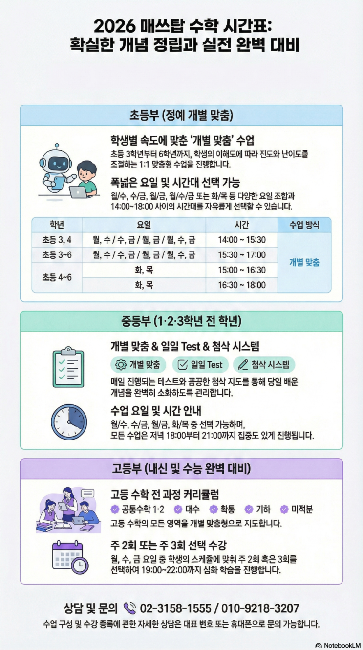이제 곧 개학을 앞두고 기대반 걱정반이실텐데요.~ 저희는 초중고 맞춤수업을 진행하는 강점이 있어요~ 수업 원칙은 같지만, 초중고등부 수업시간과 요일 참고하시어 편하게 문의주세요. 중등 & 고등과정 <img src="https://blogthumb.pstatic.net/MjAyNjAyMjFfMjE2/MDAxNzcxNjg1ODQzNTMy.1TrPeFoUS6jWnyB_QXXWlx1UzouhiM8i-tl2tku7gNEg.dc8eTTOsuZLkbVptLvSIlOi5Ij50THCxFk4yg50gC7Ug.PNG/900%A3%DF1771050261058.png?type=s3" />