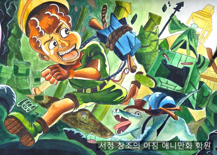 안녕하세요 서정 창조의아침 애니만화학원입니다. 오늘은 애니 대학교학교 진학을 목표로 준비 중인 학생의 상황표현 작품을 소개해 드리겠습니다. 작품 분석 이번 작품은 역동적인 액션 상황 표현을 중심으로 구성된 장면입니다. ✔ 1. 스토리 전달력 주인공이 로프에 매달려 이동하며 위기 상황을 탈출하는 장면입니다. 캐릭터의 표정, 입 모양, 눈의 방향까지 살아 있어 긴박한 분위기가 자연스럽게 전달됩니다. → 애니대 입시에서 중요한 요소 “이 장면이 왜 벌어졌는가?”가 느껴지는 그림 ✔ 2. 구도와 시선 흐름 대각선 구도를 활용하여 속도감 강화 인물 → 로프 → 적 캐릭터 → 동물 캐릭터로 이어지는 시선 동선 화면을 꽉....... <img src="https://blogthumb.pstatic.net/MjAyNjAyMjFfMjcw/MDAxNzcxNjU1MzYwMDQw.5yQ1ZxoK9_W97rsPfHiZmpjxmBiSax6vu9MNUH4_y7kg.ho77BPZTx2RGfd7LU6GmIz3J_0YjS8BMjMqYbFywcr8g.JPEG/%B0%ED%B5%EE_%283%29.jpg?type=s3" />