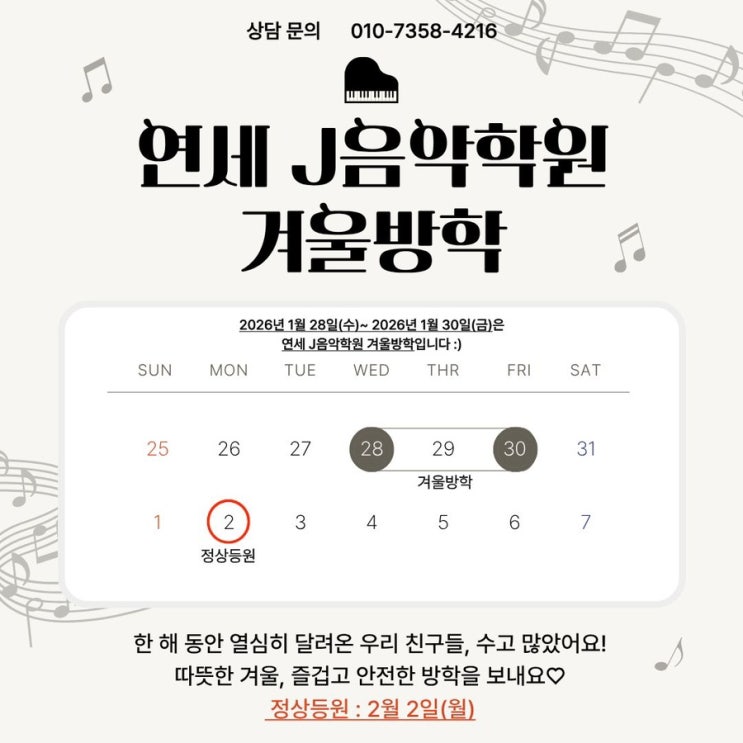 26년 1/28(수)~30(금)은 연세 J음악학원 겨울방학으로 휴원합니다. 정상등원 : 2/2(월) 감사합니다 :) <img src="https://blogthumb.pstatic.net/MjAyNjAxMjJfMTg0/MDAxNzY5MDg2NDk0NDAy.UWuATjgZy3XSPpF6dqgOpH-42Q_oVbrHL4M8dFxhihsg.ArPrbWcQt9sPsP-G7EX6hl3ilGD6OdN9kVGc1P-vz5cg.JPEG/IMG%A3%DF4546.JPG?type=s3" />