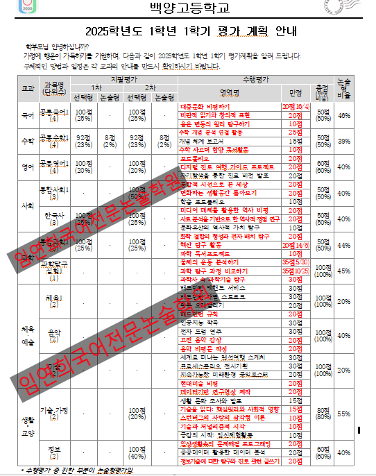 안녕하세요^^ 임연희 국어전문 논술학원 입니다. 본 원에 재원중인 예비고1 고등부 학생들은 겨울방학동안 수능형 국어 학습과 논술형 학습을 병행하는 시기 입니다. 재원생중 26학년도 백양고 입학이 확정된 예비고1 학생들과 학부모님들 께서는 고등학교 입 학 후 첫 학기에 이루어지는 평가에 대한 고민이 많으실텐데요... 전년도 백양고 1학년 1학기 평가계획안을 바탕으로 지필평가와 논술형 수행평가를 위한 논술수업을 전략적으로 준비하면 1학년 1학기에서좋은 성적을 거둘 수 있습니다. 논술수업을 위해서는 3월부터 평가가 시작되는 전과목 논술형 평가비율을 먼저 이해해야 합니다. 평가 비율을 먼저 이해해 합니다. 25학년도 백양고....... <img src="https://blogthumb.pstatic.net/MjAyNjAxMjVfMTg0/MDAxNzY5MzMyMzg3ODk4.R1UlKiTDuULlsfpo73HzyDzjPNRazpGegFajYStYlfMg.qTqU_b6kEF_3fxRGhGtMict3YVCKkPaVY5kRG45BQdQg.PNG/%BD%BA%C5%A9%B8%B0%BC%A6_2026-01-25_134707.png?type=s3" />