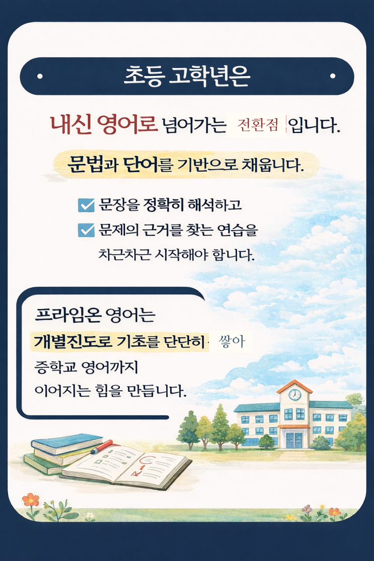 은평구 초등 영어 점검③ 수업의 성격을 바꿔야 할 시점입니다. 안녕하세요, 은평구 연신내에서 학생 눈높이에 맞춘 1:1 개별진도 수업을 진행하고 있는 프라임온 영어 원장 이영인입니다. 오늘은 초등 영어 학습 시리즈 마지막으로 아이 수준에 맞춘 개별지도 수업 관점에서 어학원식 영어에서 '내신 영어'로 전환해야 하는 이유를 정리해보려 합니다. 선일초 갈현초 초등 저학년까지의 영어는 흥미와 노출 중심의 수업이 분명 효과적일 수 있습니다. 영어에 대한 거부감을 줄이고, 언어를 자연스럽게 접하는 과정이기 때문입니다. 하지만 초등 고학년이 되면 수업 방식 자체를 다시 점검해야 하는 시점이 됩니다. 영어는 더 이상....... <img src="https://blogthumb.pstatic.net/MjAyNjAxMjdfMjA0/MDAxNzY5NTIwMjAxNDk2.SJaB_Y7HDwI5vR-D7OSuEM9xWDyeWmfm1TzBQrgkvl4g.DG-ViUXSuIV02EaL5DTL_YeQ9rvLHMXbbMZFuLw7CDQg.PNG/ChatGPT_Image_2026%B3%E2_1%BF%F9_27%C0%CF_%BF%C0%C8%C4_10_04_36.png?type=s3" />