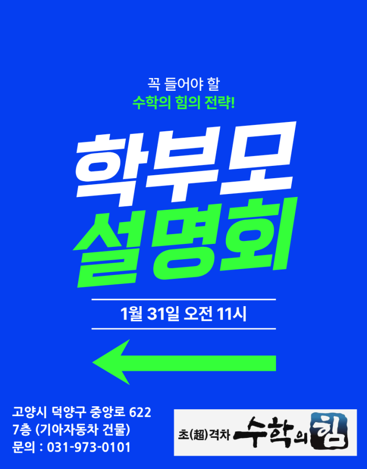 안녕하세요 수학의 힘 화정캠퍼스입니다. 3월 새학기에 앞서, 많은 것들을 준비하고 계실거라 생각합니다. 거기에 맞게!! 수학의 힘에서도 색다르게 준비하고 바뀌는 내용들을 학부모님께 전달드리고자 자리를 마련했습니다. 중요한 사항들 일부만 말씀드리겠습니다. -3월부터 다르게 시작하는 수업시간 -수학 과정 중 바뀌는 내용 -더욱 더 체계적으로 하는 클리닉 관리(누적 테스트) 등등 다양한 내용과 궁금한 점 있으시면 오셔서 편하게 말씀해주시면 감사하겠습니다. 재원생같은 경우, 일괄 문자로 링크 보내드렸습니다. 그 링크를 통해 예약 진행 해주시면 됩니다. 재원생이 아닌 경우, 학원으로 전화주시면 예약 도와드리겠습니다. 수학의....... <img src="https://blogthumb.pstatic.net/MjAyNjAxMjBfMTQ0/MDAxNzY4ODg2NDA2ODM0.U1_5AfkyEmtFGmt47RftqgJnQft1JZyE-W2t1RxdE10g.46HmFdQvBL50CaO6Xov1tBMl6eEbhFt5NboLtjbFBpcg.PNG/%BC%B3%B8%ED%C8%B8.png?type=s3" />