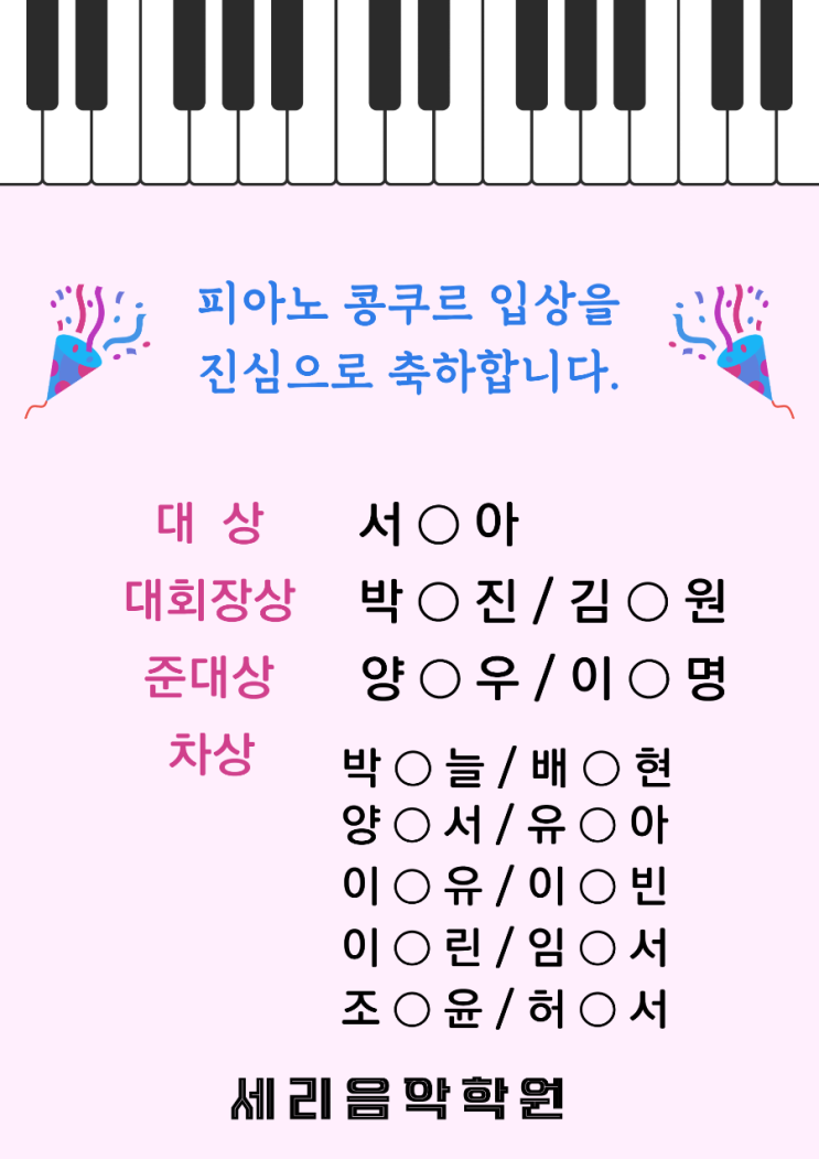 처음으로 콩쿨을 준비한 아이들~ 아이의 장점을 더 돋보이게 하는것에 중점을 두고 부족한 부분은 천천히 나아지게 하는 레슨을 두 달정도 하였다. 아이들과의 준비 과정은 아이들을 더 가까이 엿볼 수 있는 의미 있는 시간들이였다. 쉽게 들어 나지 않는 모습을 보면서 지도하는 입장에서도 큰 학습이 되어 소중한 시간이였다. 결과는 아이들 연습시간에 비례 할거라 믿기에 평온한 마음으로 대회를 지켜 보았다. 수고 많았을 우리 아이들, 강사님들,그리고 마음 졸였을 부모님들, 함께여서 좋았습니다^^ <img src="https://blogthumb.pstatic.net/MjAyNjAzMDhfMjI5/MDAxNzcyOTM4ODI4NDM0.Tdu8dhwl6MFJv19ZsYHt6lfQfUd-Z81BX7cUNKT2A-Eg.1sgSXN9NGzPr-JPH-Yj5aA8IxGp5A9J1j15yHje8I2Eg.PNG/900%A3%DF1772935150501.png?type=s3" />
