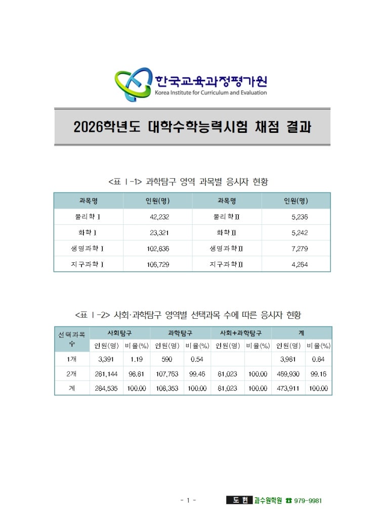 ★ 2026년 수능 과학탐구 실제 응시 인원 및 등급분포 ★