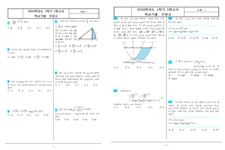 제가 올리는 기출자료는 2024년 무원고등학교 2학년 1학기 수1 기출입니다. 현재 고등학교 교육과정은 2022 개정 교육과정이 적용되면서 기존의 수학Ⅰ 단원이 ‘대수’ 과목으로 개편되었습니다만, 실제 내용을 비교해 보면 지수와 로그, 삼각함수의 핵심 내용 자체는 크게 달라지지 않았습니다. 따라서 기존 수학Ⅰ 기출문제 역시 학교 시험의 출제 경향을 파악하는 데에는 여전히 충분히 참고할 수 있는 자료입니다. 물론 개정 교육과정에서는 계산 중심 문제보다는 개념 이해와 그래프 해석을 강조하는 방향이 제시되고 있어 앞으로 시험에서는 문제의 표현 방식이나 유형이 조금 달라질 가능성은 있습니다. 하지만 실제 학교 시험은 교육과....... <img src="https://blogthumb.pstatic.net/MjAyNjAzMTJfMjI5/MDAxNzczMzE3NjM4Mjk3.u5QhebxdmlVyTvS3_TQ6CLsk3X1Aw9FnT0n1s7Eyrdog.ejuYyrQYLXQSvx-8wbSU15NCH6mIGrNgCxJBgST7xfMg.PNG/008.png?type=s3" />