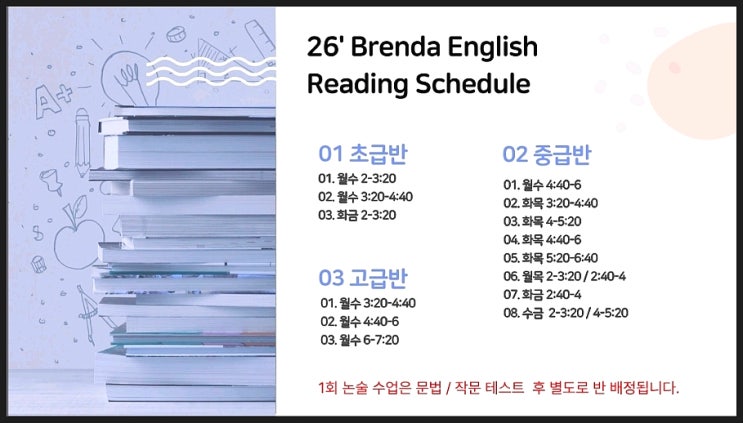 안녕하세요, 지축 영어 정독학원 브렌다영어입니다. 작년 여름 이후 또 정신없이 수업과 학원 일정을 소화해내다보니 블로그에 글쓰는 것도 priority 에서 점 점 멀어져 갔네요. 반성하는 마음과, 또 새학기를 맞이하여 심기일전 하는 마음을 담아 26년 신학기 스케줄을 올려봅니다. 26년은, 주 3회 80분 수업으로 개정되어, 주 2회 원서정독수업 + 주1회 영어논술 수업으로 진행됩니다. 레벨 별 수업으로 시간표는 아래와 같습니다. ERC 영어독서클럽 정독프로그램은 A-K까지 총 11단계로 세분화되어 있습니다. 브렌다영어학원에서는, 1 )초급: A-D 2) 중급: E-G 3) 고급: H-K 으로 나누고 있으며, 레벨테스트 결과와 학년을 고려하여 반 배정하....... <img src="https://blogthumb.pstatic.net/MjAyNjAzMTBfNTMg/MDAxNzczMTQwNjQxMzYx.1YDrpD_YnUBiX3sRDasaKD4LJUNBBtIryL38ZF5vVdsg.SPRm4DPVmg_bDt6pazTyk2SSDcmy0vQSFZFYMbyQuEcg.JPEG/900%A3%DFScreenshot%A3%DF20260310%A3%DF195709%A3%DFHancom_Office.jpg?type=s3" />
