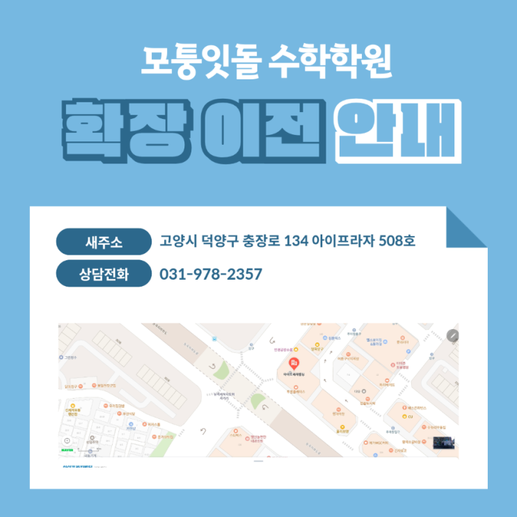 행신동 화정동 수학학원 모퉁잇돌 수학학원 원장 홍마에입니다. 오랜만에 글을 올립니다. 늘어난 원생들 하나하나에 신경 쓰면서 치열하게 맞이한 또 한 번의 겨울방학을 아침부터 밤까지 친환경 에너지 "학구열"로 뜨겁게 난방하며 보냈습니다.^^ https://m.blog.naver.com/mirunamu1199/223754685865 많은 부모님과 학생들의 관심과 응원으로 날로 성장하고 있는 모퉁잇돌 수학학원이 개원 이후 가장 큰 변화를 맞이하게 되었습니다. 바로 '확장 이전.' 3월부터 길 건너 아이프라자 5층으로 이전하여 수업합니다. 공간은 2배가 되었고, 시설은 더욱 좋아졌습니다. 현재 이전 작업이 마무리되었습니다. 모퉁잇돌 수학학원은....... <img src="https://blogthumb.pstatic.net/MjAyNjAyMjdfOCAg/MDAxNzcyMTMwNjY3OTI1.oL3AVbZSRoThp5aDnWzEiRD8lIKh-SWc-HQqx-kQiRAg.dVlHntPAZBTuICY8gkyHbKbIpLdfsSv3sTFCtUQoQIUg.PNG/%C1%A6%B8%F1%C0%BB%A3%DF%C0%D4%B7%C2%C7%D8%C1%D6%BC%BC%BF%E4..png?type=s3" />