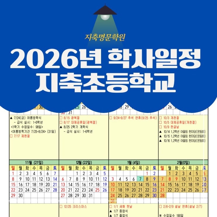 안녕하세요. 지축명문학원입니다. 어느덧 설 연휴도 끝나고 우리 학생들에게는 새 학기 전 1주일의 시간만이 남았습니다. 방학 때 지축명문학원 학생들은 새 학기 준비를 모두 마쳤죠? 수학. 영어 실력을 2배 이상 향상시킨 시간이었어요. 방학 동안 학원 진도, 보충수업 모두 적극적으로 참석하고 따라와 준 학생들에게 다시 한번 칭찬의 메시지를 보냅니다. 지금부터 2026학년도 지축 초등학교 학사일정 먼저 정리해 드릴게요. 2026학년도 총 수업일수는 190일입니다. 1학기 98일, 2학기 92일로 운영됩니다. 지축 초등학교 2026년 1학기 주요 일정 3월 3일 시업식 및 입학식 5월 1일은 개교기념일로 재량휴업일 5월 4일 역시 재량휴업일 5월 5일....... <img src="https://blogthumb.pstatic.net/MjAyNjAyMThfNDMg/MDAxNzcxMzgzNjkwNTE0.3HR0FIHUzMud3Ei68WcjyPmTWjFByBApDJp18e4hh88g.0m2aXQUWA9NJ1llsxEaJQtHX-TGlAK88KRhJ8OxtCqcg.JPEG/%C1%F6%C3%E0%C3%CA%B5%EE%C7%D0%B1%B3.jpg?type=s3" />