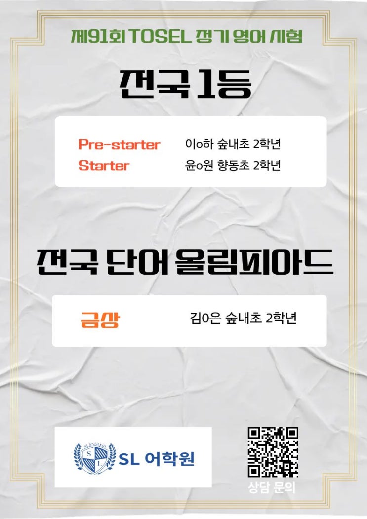 제91회 TOSEL 영어시험 전국 1등 배출 안녕하세요. SL어학원입니다. 이번에 고려대학교에서 주최한 제91회 TOSEL 정기 영어 시험에서 저희 학원 학생들이 Pre-Starter 부문 전국 1등, Starter 부문 전국 1등이라는 매우 기쁜 소식을 전하게 되었습니다. 아이들이 스스로 꾸준히 공부하며 쌓아온 노력의 결과라고 생각합니다. 학원에서의 학습뿐만 아니라 가정에서도 꾸준히 응원해 주신 학부모님들께도 감사드립니다. 특히 더 고무적인 점은, 보통 3~4학년 수준에서 응시하는 Starter 레벨 시험에서 초등학교 2학년 학생이 전국 1등을 했다는 점입니다. 이는 단순히 시험 준비만으로 만들어진 결과라기보다, 평소에 꾸준히 쌓아온 영어 기초와 학....... <img src="https://blogthumb.pstatic.net/MjAyNjAzMTZfMTQ1/MDAxNzczNjU1ODc3Njgw.hkAzbJt2dkhnRfCBc3q9RRXSilAkA78vLp_JcgtuwBgg.ZT_qR5BgVEO_L8bnqzDhL1YkMRAUZXQjis_icSq_ivwg.JPEG/%C1%A6%B8%F1%C0%BB_%C0%D4%B7%C2%C7%D8%C1%D6%BC%BC%BF%E4._%286%29.jpg?type=s3" />
