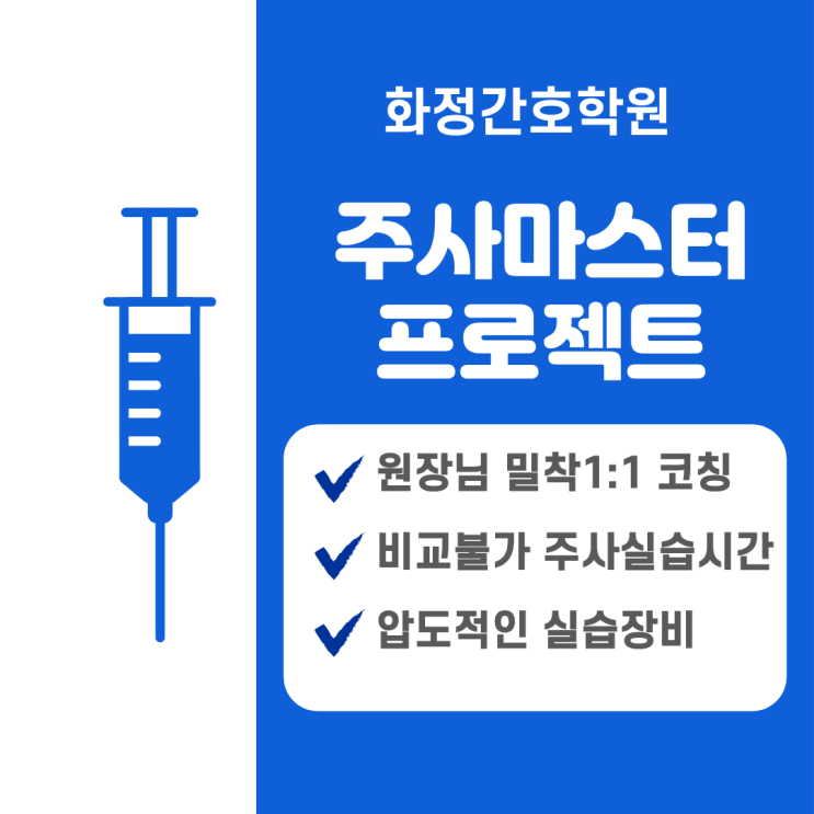합격률우수! 만족도우수!취업률우수! 우수훈련기관 화정간호학원입니다 오늘은 간호조무사를 도전하는 학생이라면 누구나 걱정하는 주사기술!! 화정간호학원은 주사에대한 고민을 자신감으로 바꿔드립니다. 차별화된 주사실기 마스터 프로젝트 ✅ 원장님의 1:1 코칭 + ✅ 비교불가 연습시간 + ✅ 압도적인 실습장비 결과가 다를 수밖에 없습니다!" [화정간호학원] 주사 실기의 특징 코칭빨 ➕ 장비빨 ➕ 연습시간빨! 1️⃣ 베테랑 원장님의 1:1 밀착 코칭 주사는 어떻게 연습하냐가 중요합니다 단순한 시범만 보셨나요? 장비만 주어지고 잘못된방법으로 학생 혼자 연습하나요? 화정간호학원의 주사실기는 코칭빨!! 베테랑 원장....... <img src="https://blogthumb.pstatic.net/MjAyNjAzMjJfMTcz/MDAxNzc0MTgzNTAwODA1.5kvcAIVi8PXHooqtZzNKbqDulE4ZGZ5JxkqVOGpwj4gg.U14XoAzSUCn5Jv1Rtt6hq46c_d5Hx0G-1DPw-v8Bgukg.PNG/%C1%D6%BB%E7%B8%B6%BD%BA%C5%CD.png?type=s3" />