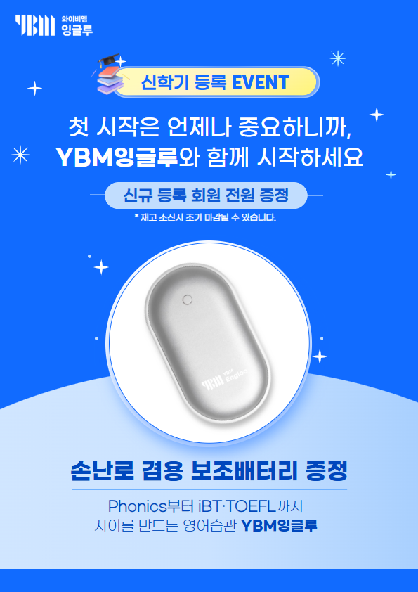 안녕하세요, YBM잉글루 도래울입니다. 새해가 되면 새로운 학기, 새로운 시작을 준비하는 친구들이 많아지죠 방학이 끝나고 학원이동도 잦아지는 이 시기, 잉글루에서는 새롭게 시작하는 친구들을 응원하고 싶어요! 그래서 2026년 신학기를 맞아 신규로 등록하는 정회원 친구들에게 따뜻한 선물을 준비했어요. 새학기 응원 이벤트 안내 추운 겨울 ,등하원길에도 학습할 때도 유용하게 사용할 수 있는 '손난로 겸용 보조배터리'를 선물로 드립니다! 이벤트 기간: 2026년 1월 1일(목)~3월 31일 (화) 이벤트 대상: 이벤트 기간 내 신규 등록 정회원 *퇴관 후 6개월 이내 재등록생은 제외됩니다. 증정 상품: 손도 따뜻하게, 핸드폰도 든든....... <img src="https://blogthumb.pstatic.net/MjAyNjAxMDhfNTAg/MDAxNzY3ODQ5NDQwOTU3.jvCSO5tKatSYQ5jKfC1sTDXMCv_GczxhDZMyPWmVdwMg.krhAe4nRrmgjpnIBGBg0zonseudOt1orZvTgLY6T1gAg.PNG/%BD%C5%C7%D0%B1%E2%B5%EE%B7%CF%C0%CC%BA%A5%C6%AE_%281%29.png?type=s3" />