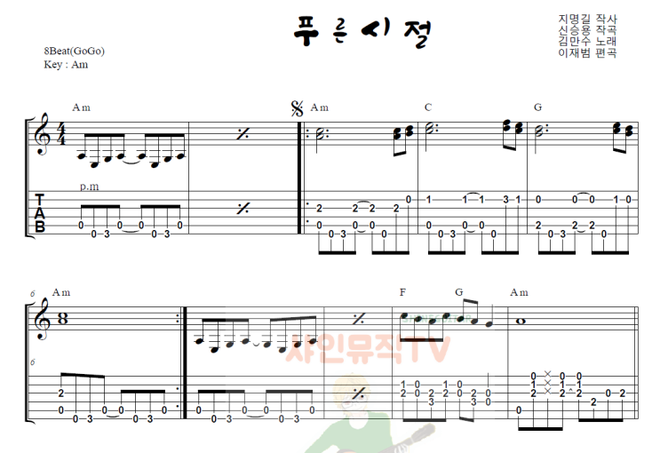 [타브악보] 푸른시절 통기타 완전정복/행신동통기타학원/행신동실용음악학원