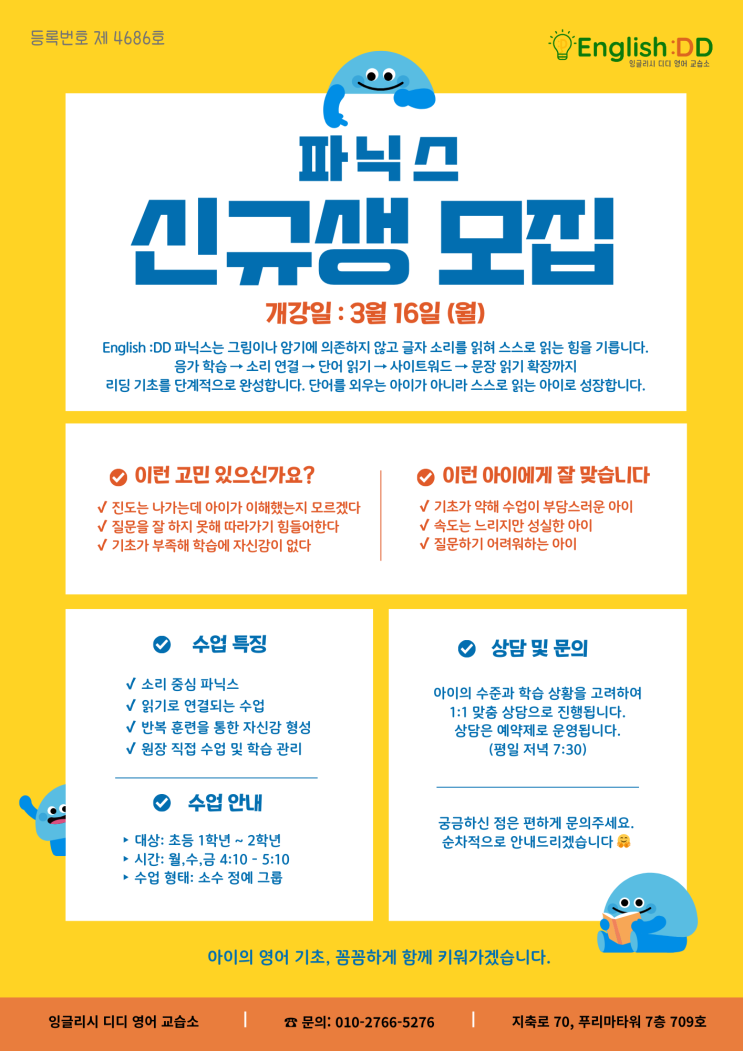안녕하세요. 잉글리시 디디입니다 ^^ 기다리고 기다리던 파닉스 신규반이 오픈했어요! 모집 안내 도와드리겠습니다 현재 운영 중인 파닉스 정규반입니다. 3월 16일에 오픈하여 신규생을 모집하고 있습니다 ✨ 초등학교 1~2학년을 대상으로 기초부터 차근차근 시작하는 수업이 진행됩니다. (월/수/금 4:10 ~5:10) 아이들의 학습 수준에 따라 맞춤형 수업으로 진행되며, 영어에 흥미를 붙이고 자신감을 키울 수 있도록 도와드립니다 레벨 테스트 및 상담은 평일 저녁 7:30 예약 후 진행 가능합니다. 궁금하신 점은 언제든 편하게 문의 주세요! 문의는 카톡 또는 010-2766-5276으로 연락 부탁드립니다 <img src="https://blogthumb.pstatic.net/MjAyNjAzMTlfMTg4/MDAxNzczODk5MDQ1MDIw._P3QlwmSEJagG3mk2DzweKh69YhE8cyrEBfd2QK4lUQg.RXc2HCBFqusGSb0tlAA0Qff4ls9fH6Lm0vDOcJgmEm0g.PNG/파닉스기초원서_신규반_홍보물.png?type=s3" />