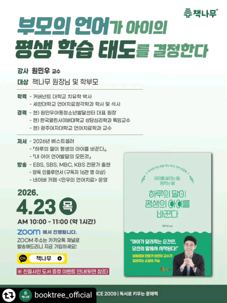 안녕하세요 책나무향동독서논술학원 향기샘입니다. 부모의 말이 아이의 평생을 바꾼다면? 아이에게 해주는 말 한마디! 그 순간은 짧지만 아이의 학습 태도는 평생 이어집니다. 그래서 이번 강의에서는 부모의 언어가 아이에게 어떤 영향을 주는지! 그리고 어떻게 말해야 하는지를 현장에서 바로 적용할 수 있도록 알려드립니다. 학부모 필수 시청! [ZOOM] 무료 강의 친필 사인 도서 증정 이벤트까지!? 원민우 교수 초청 줌 강의 (무료) ✔ 책나무 원장님 & 학부모 대상 주제 부모의 언어가 아이의 평생 학습 태도를 결정한다 일정 2026. 4. 23(목) AM 10:00 ~ 11:00 (약 1시간) ✔ 줌 강의 주소는 책....... <img src="https://blogthumb.pstatic.net/MjAyNjA0MDNfNjMg/MDAxNzc1MjIxMDA1MzQ4.pRmNynWvKMKU0Ly08kbdMVdmWLa3DfI9DRq2jTYdsG4g.9VozmiR9wiWIEegoeoqA6ET0aONWORGlFKWeHrLt2T0g.PNG/900%A3%DFDWk%A3%DFPe8k9Dd%A3%DF1.png?type=s3" />
